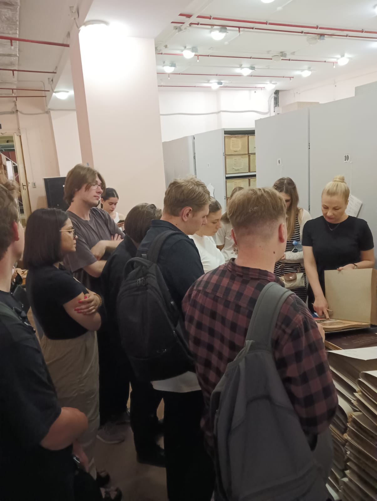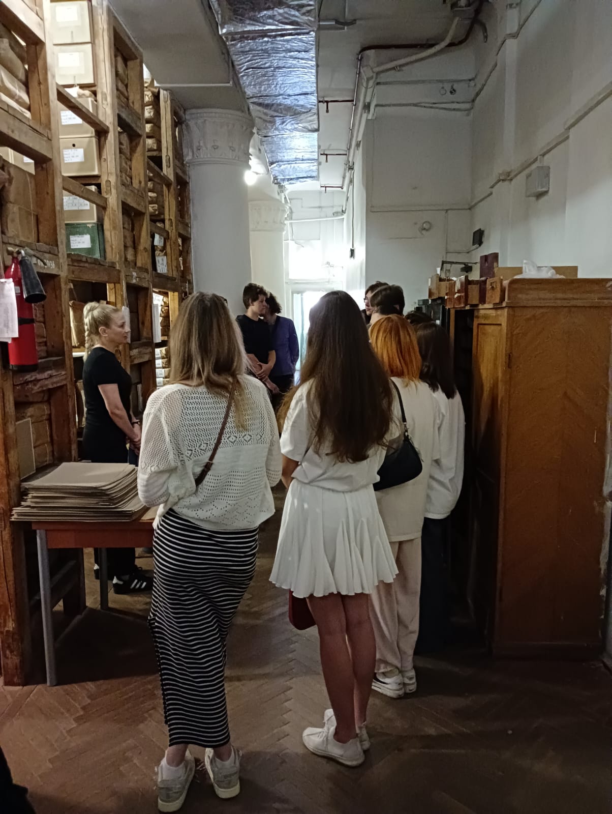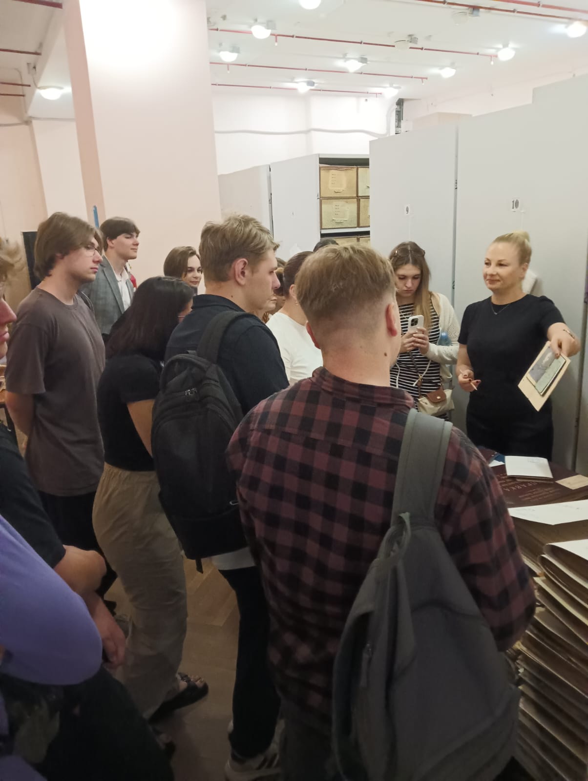 В ходе экскурсии сотрудники архива провели студентов по хранилищам, показали им фотокаталог, продемонстрировали особо ценные документы и фотоальбомы. Студенты узнали подробнее о структуре архива, видах работ, выполняемых его сотрудниками.