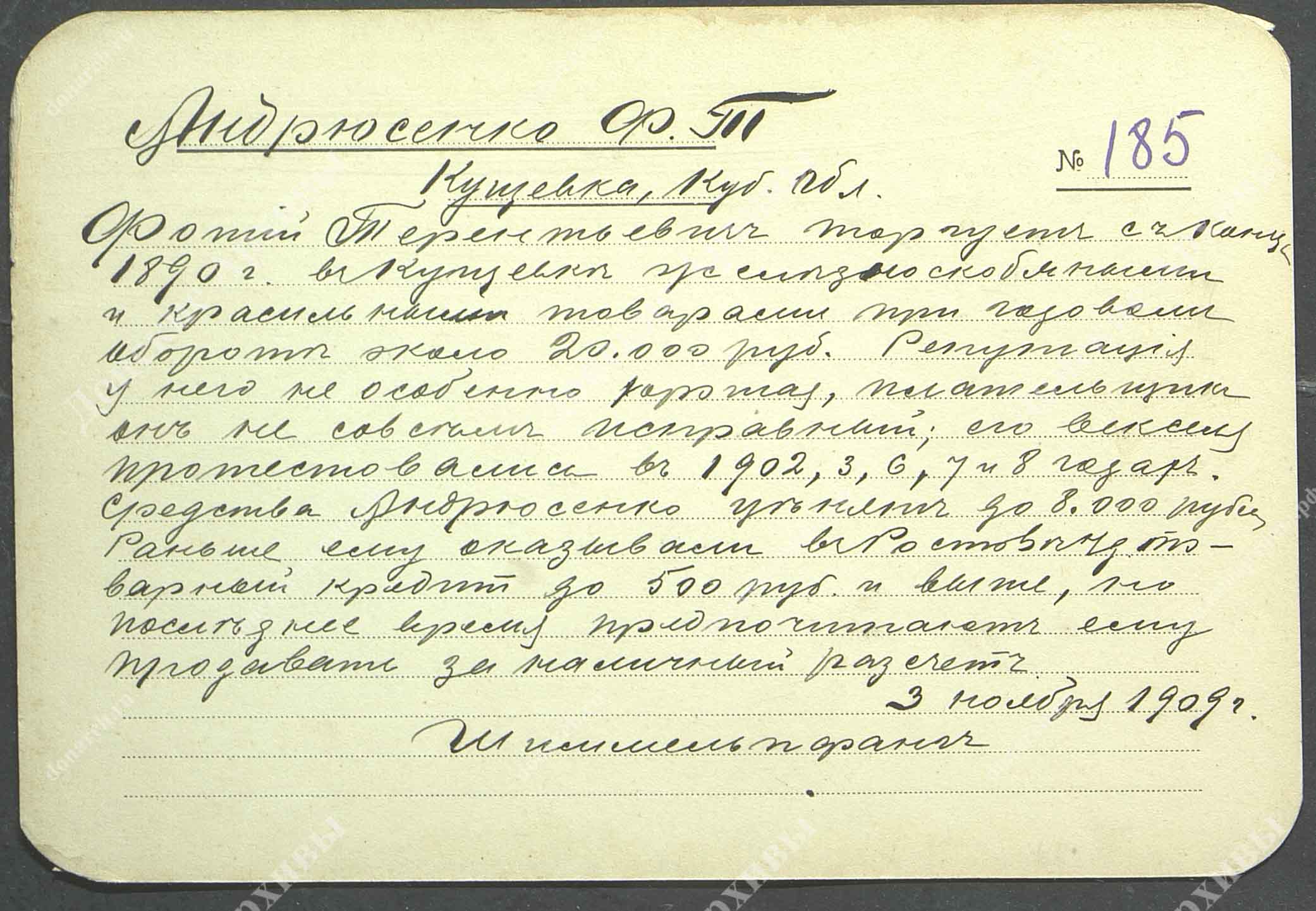 Личная карточка Андрюсенко Фотия Терентьевича, торговца железно-скобяными товарами в Кущевке Кубанской области |