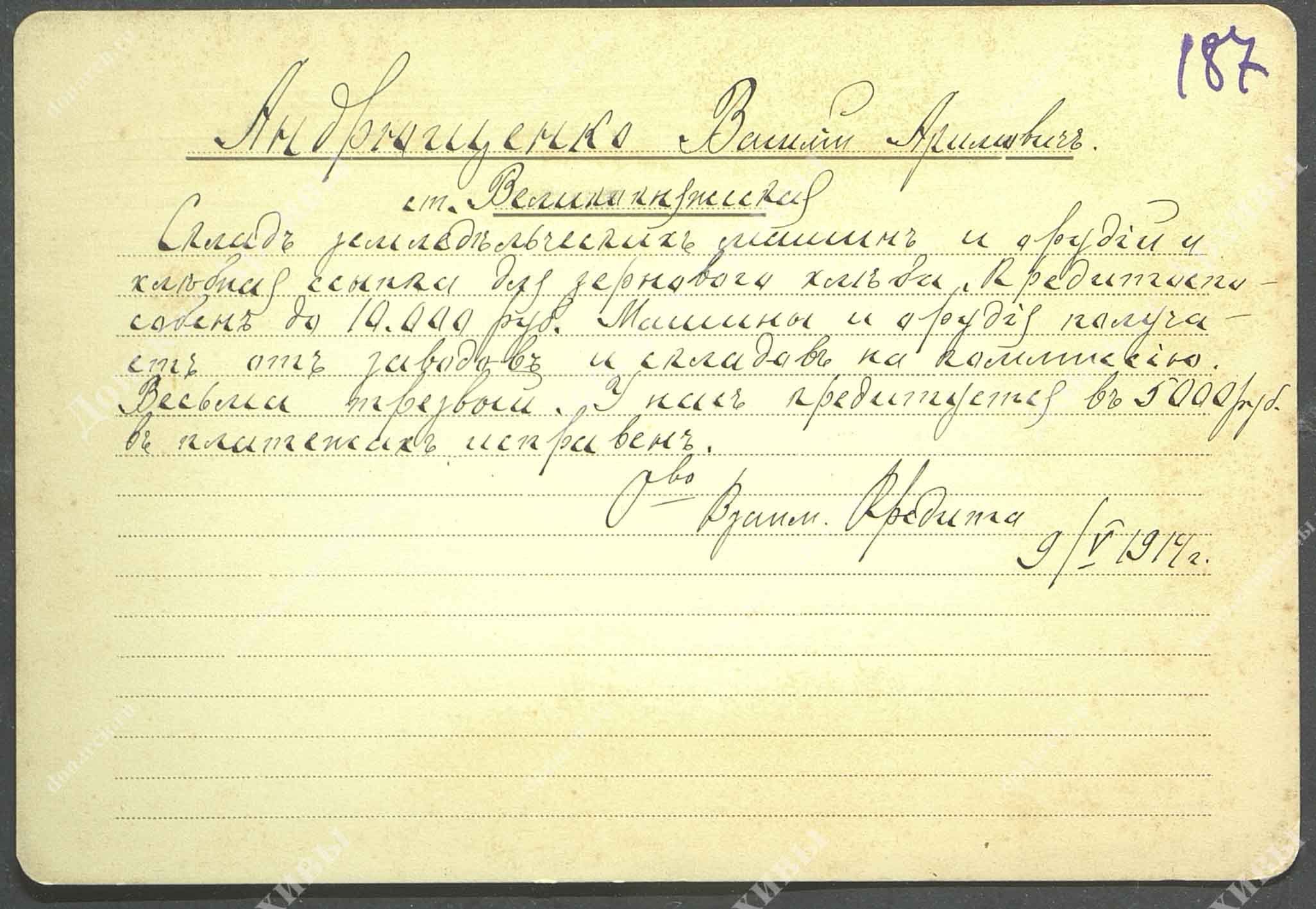 Личная карточка Андрющенко Василия Акимовича - склад земледельческих машин и орудий, ссыпка хлеба (ст.Великокняжеская) |