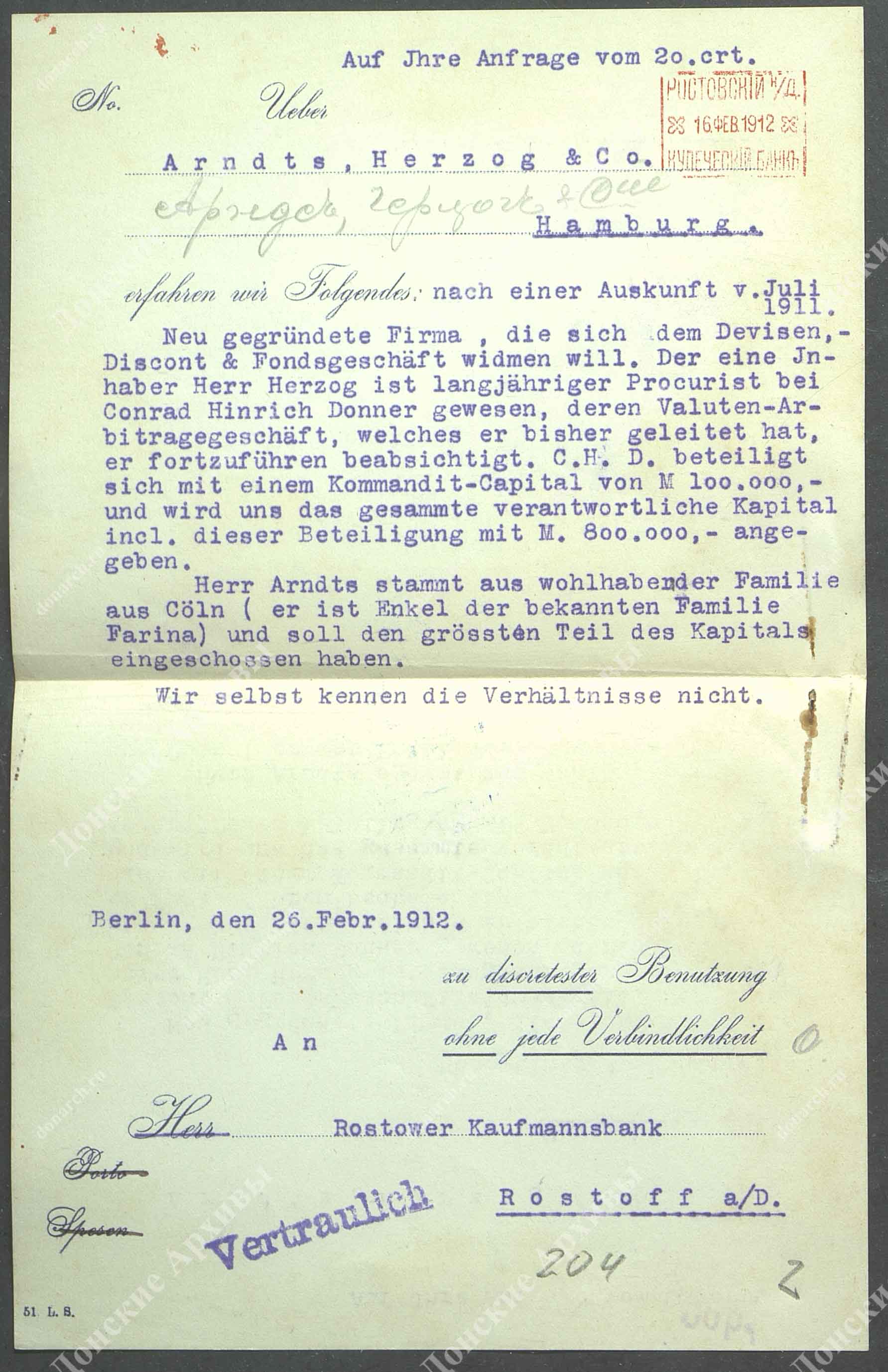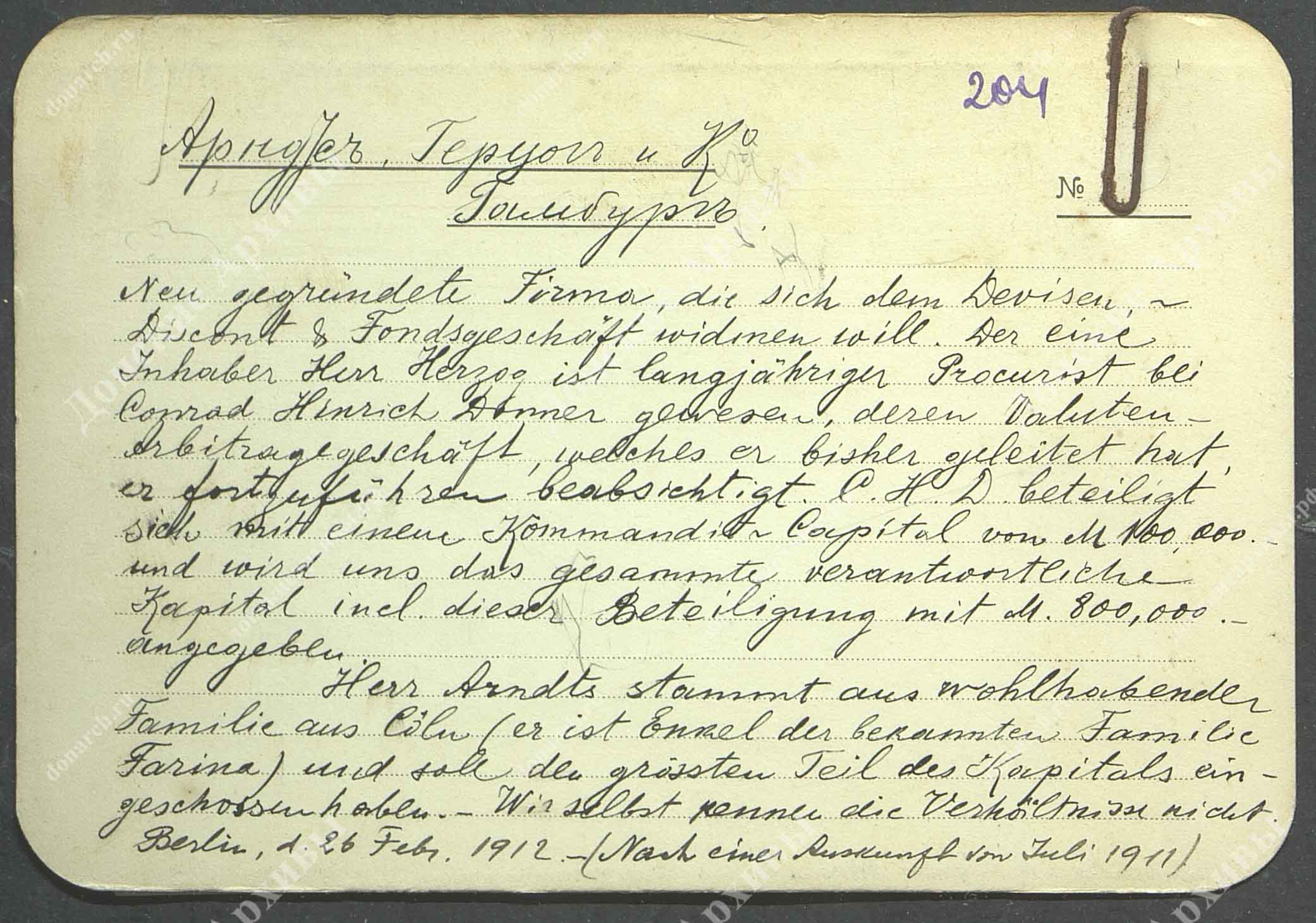 Личная карточка "Арндус, Герцог и Ко" (Гамбург) - карточка на немецком языке |