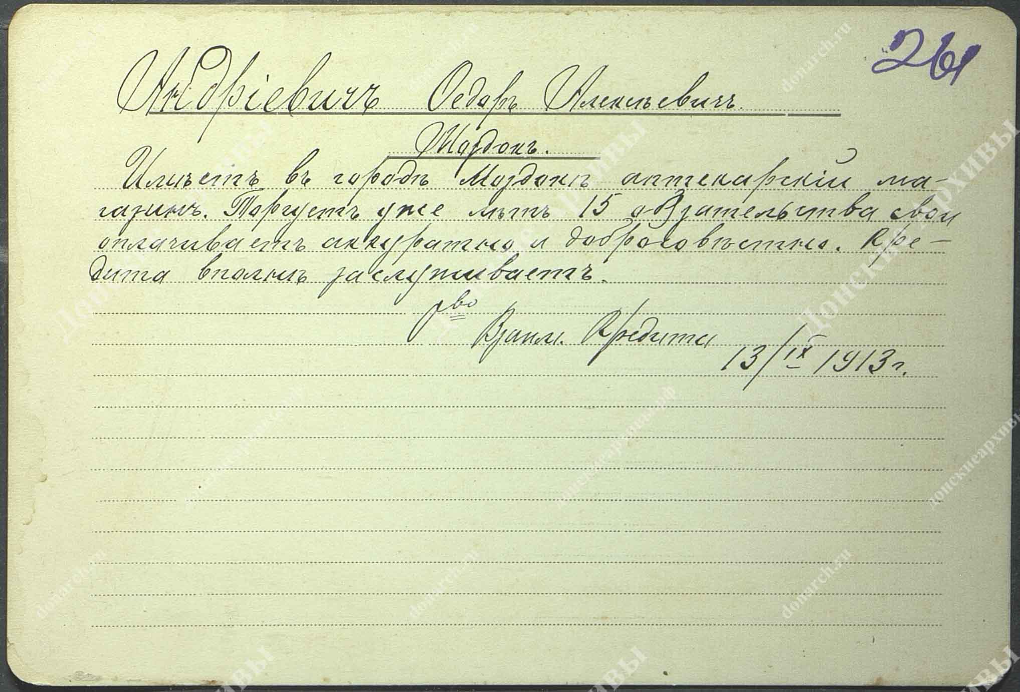 Личная карточка Андреевича Федора Алексеевича, владельца аптекарского магазина в г. Моздок |