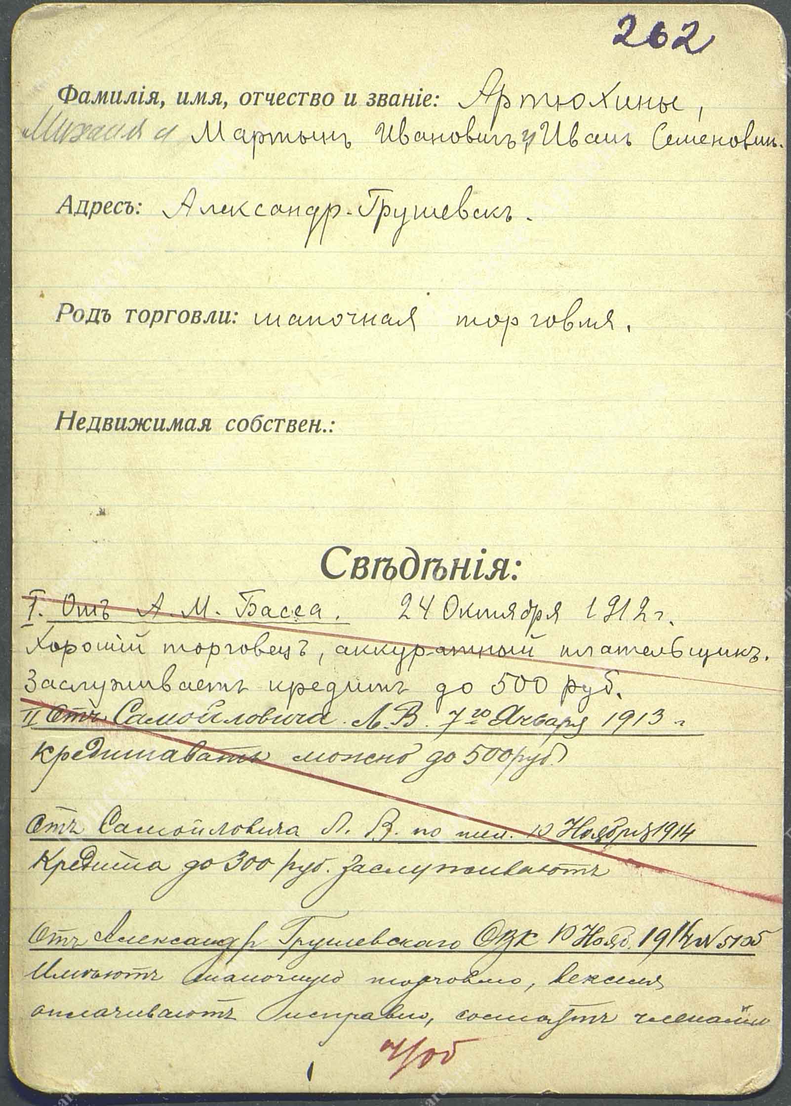 Личная карточка Артюхиных Михаила, Мартына Ивановича и Ивана Семеновича, шапочная торговля в г. Александровск-Грушевский |