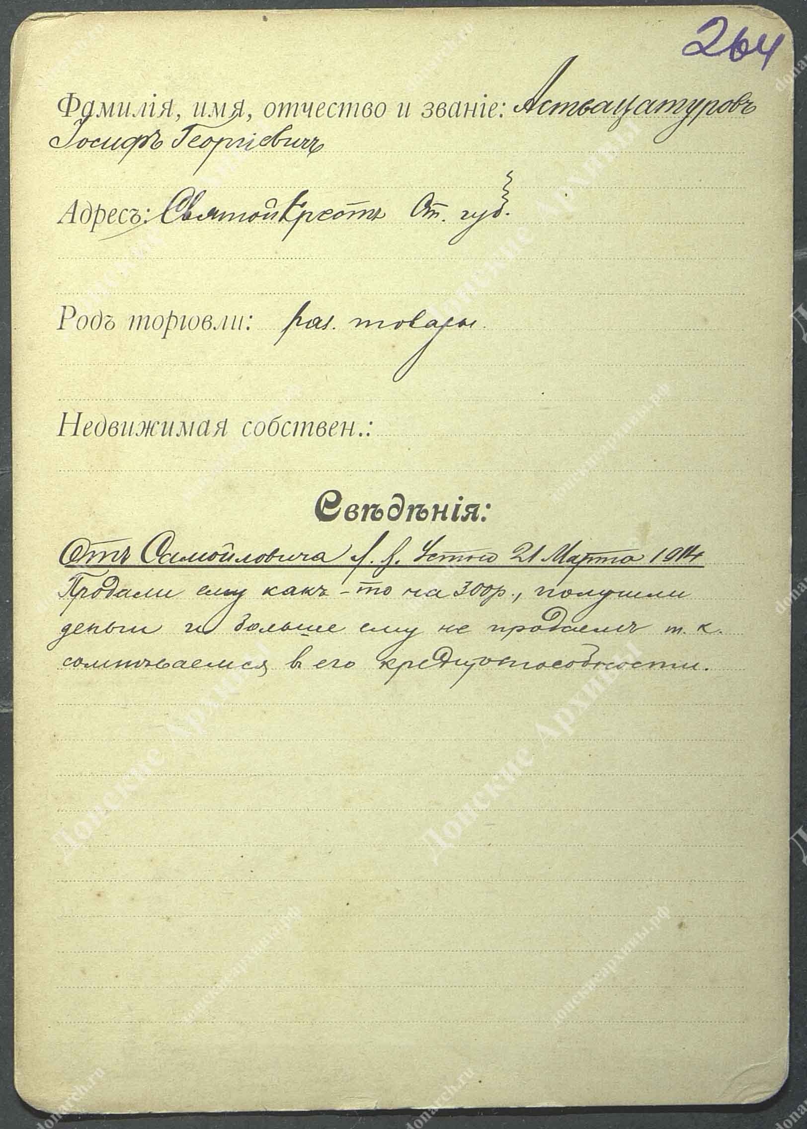 Личная карточка Аствацатурова Иосифа Георгиевича, торговца разными товарами в Святом Кресте Ставропольской губернии |
