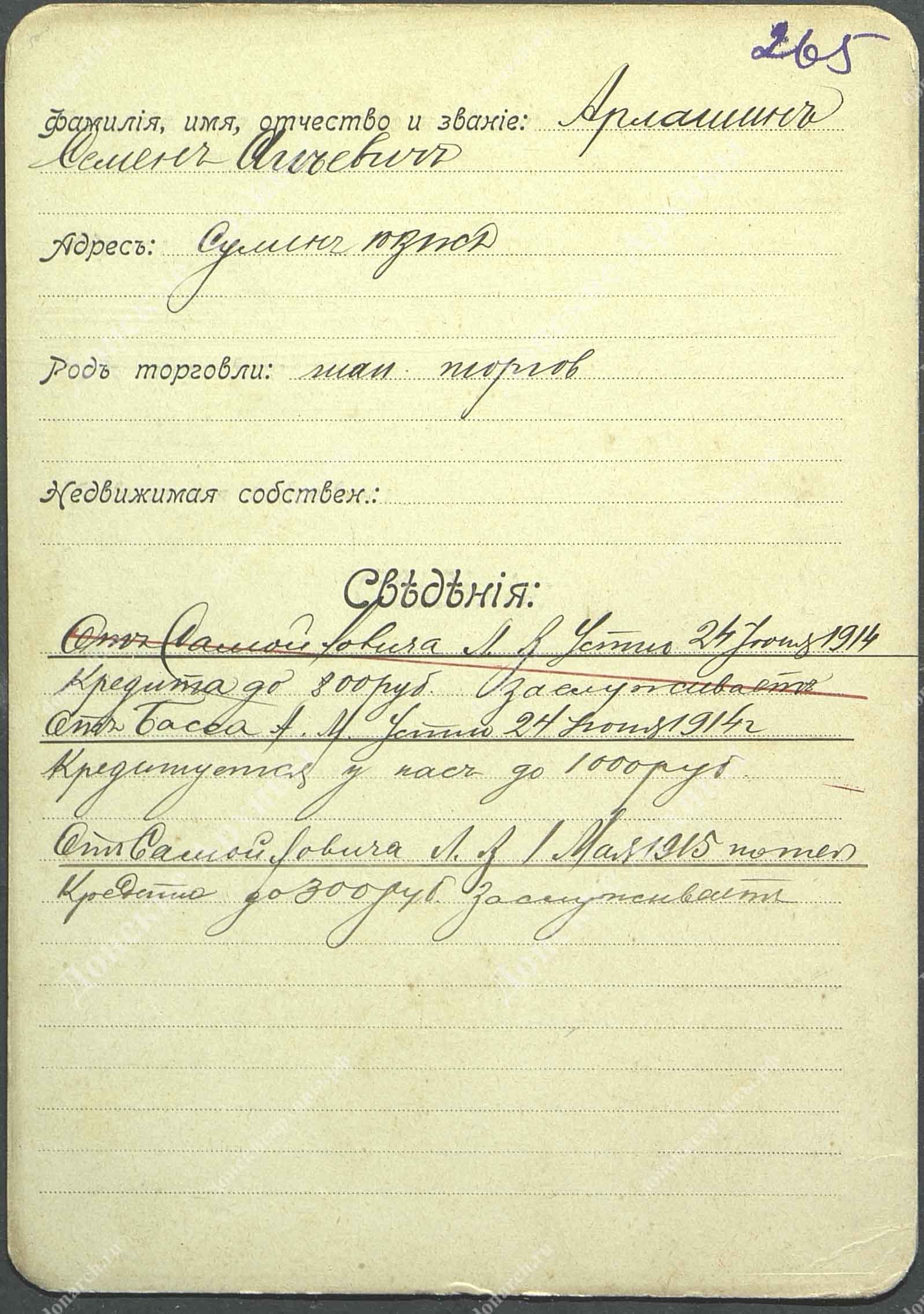 Личная карточка Арлашина Семена Агеевича, торговца шапочными товарами в Сулине Юго-Восточной ж.д. |