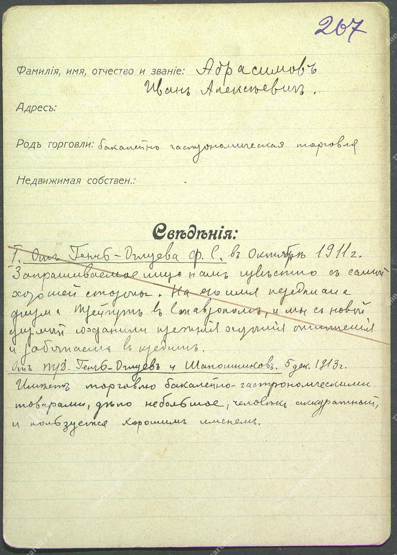 Личная карточка Абрасимова Ивана Алексеевича, торговца бакалейно-гастрономическими товарами |