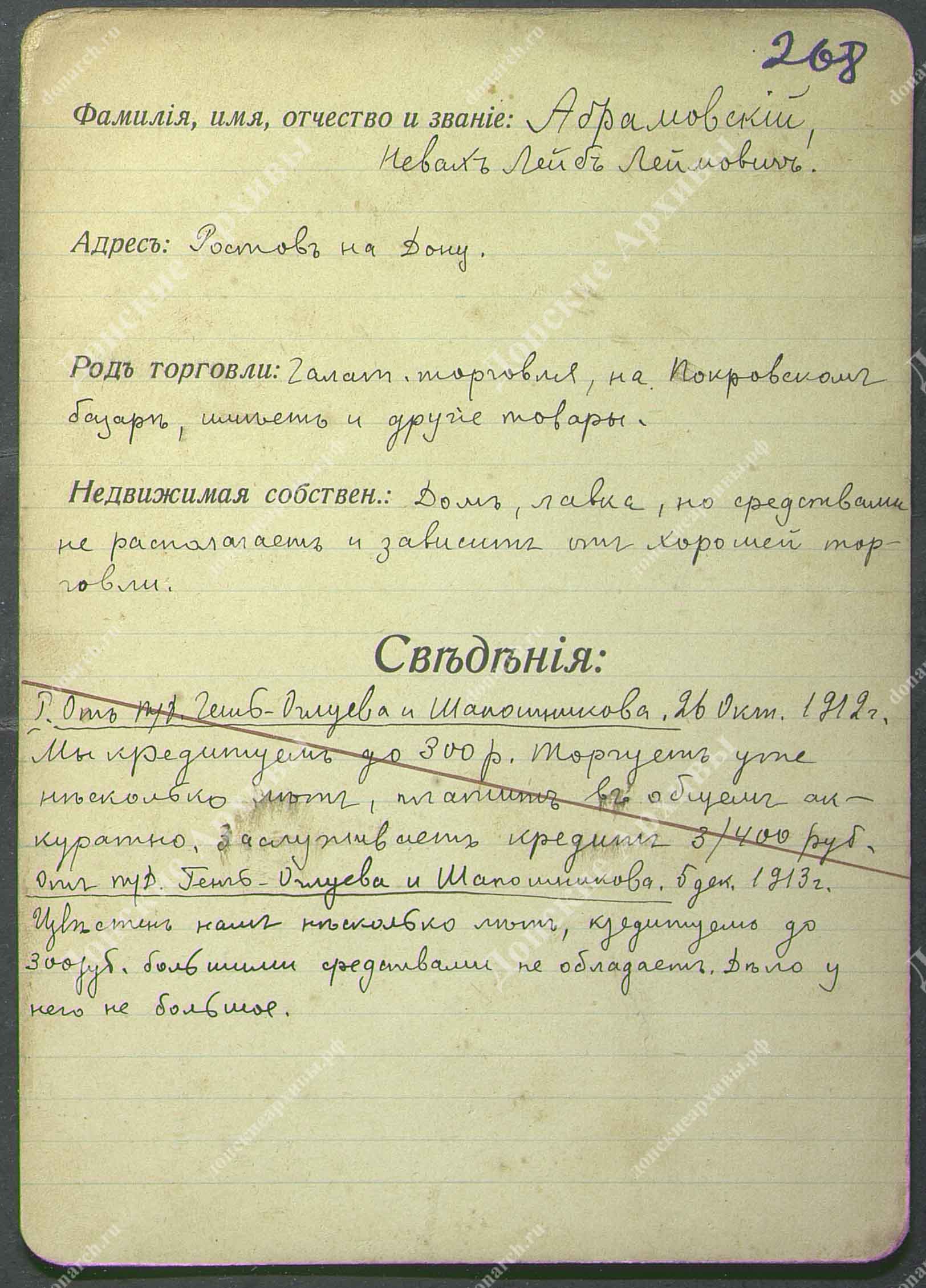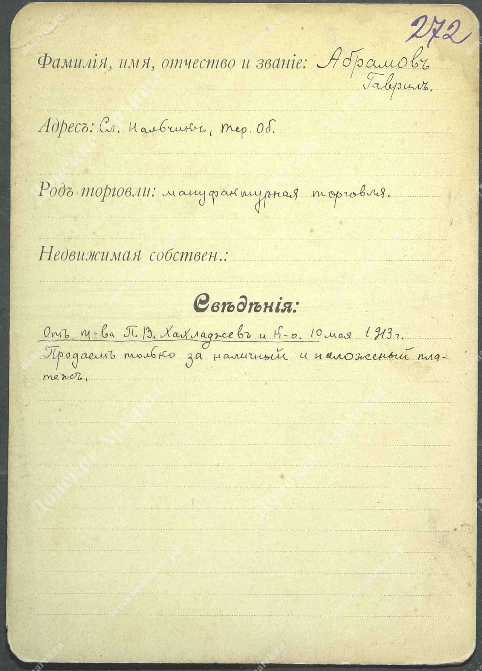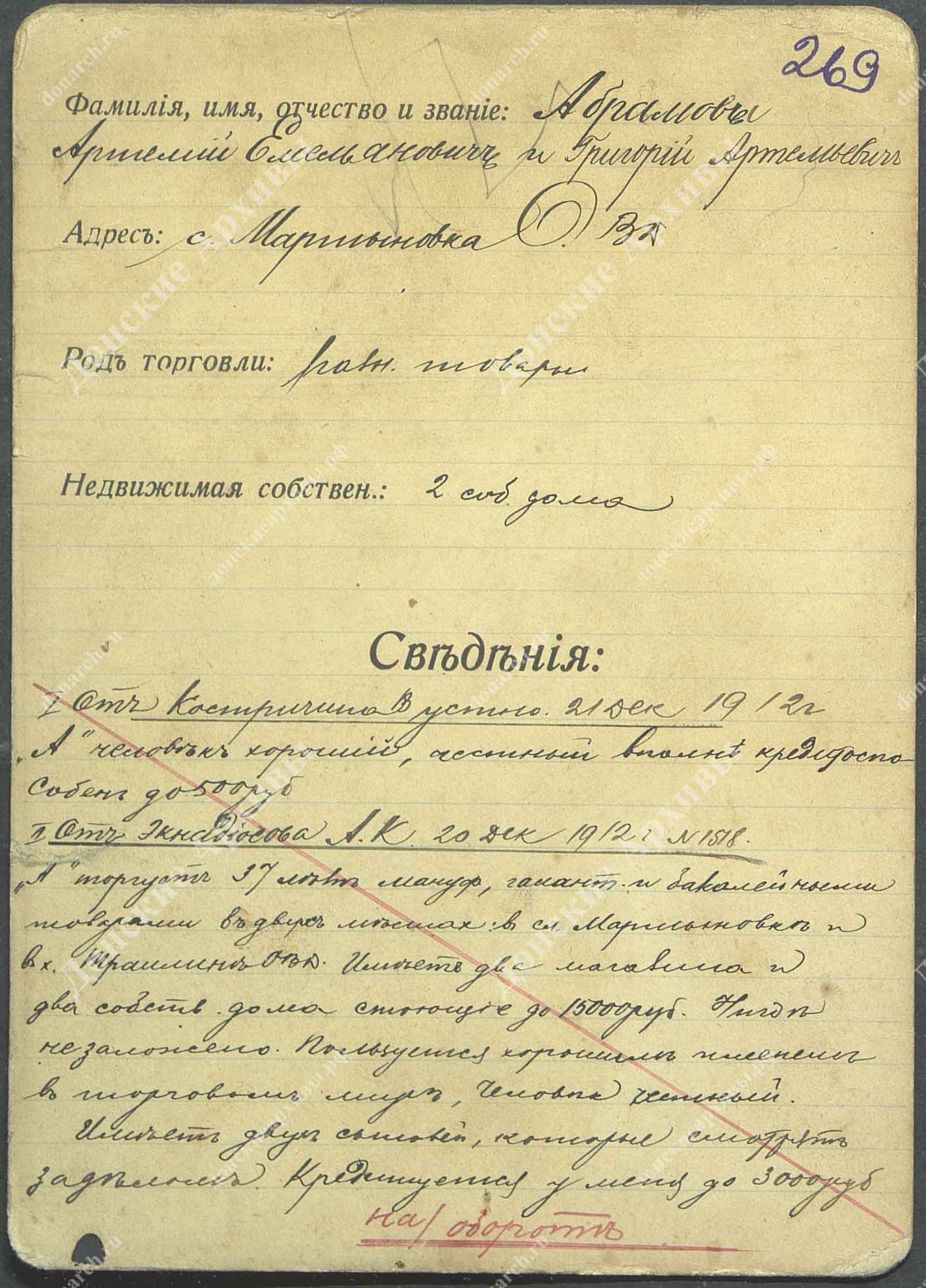 Личная карточка Абрамовых Артемия Емельяновича и Григория Артемьевича, торговцев разными товарами в с. Мартыновка области войска Донского |