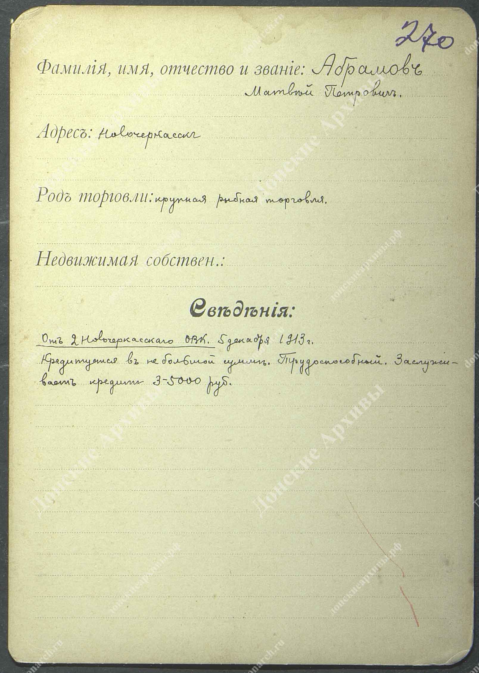 Личная карточка Абрамова Матвея Петровича - крупная рыбная торговля в г. Новочеркасске |