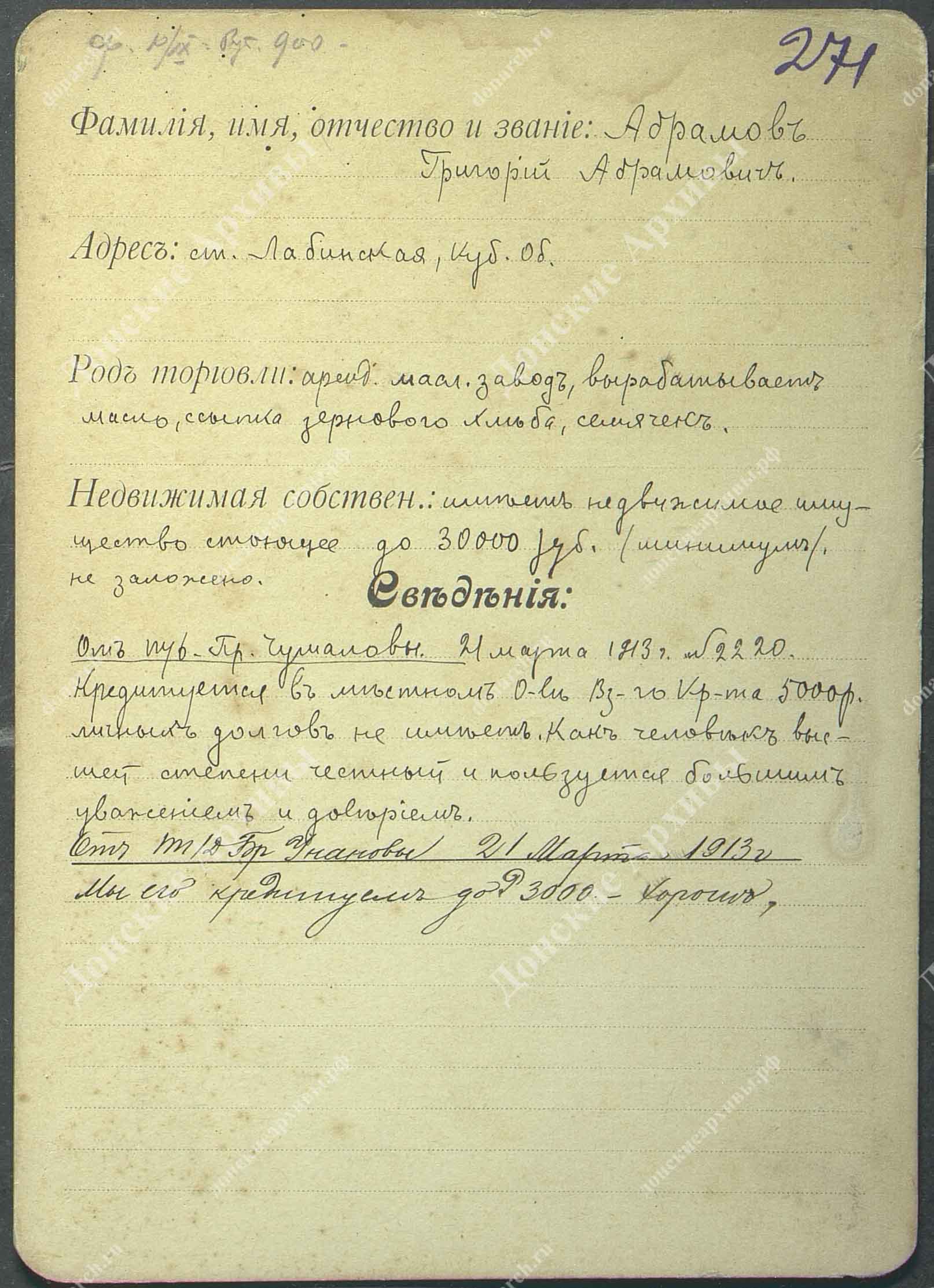 Личная карточка Абрамова Григория Абрамовича - аренда маслозавода, ссыпка зернового хлеба, семячек в ст. Лабинской |