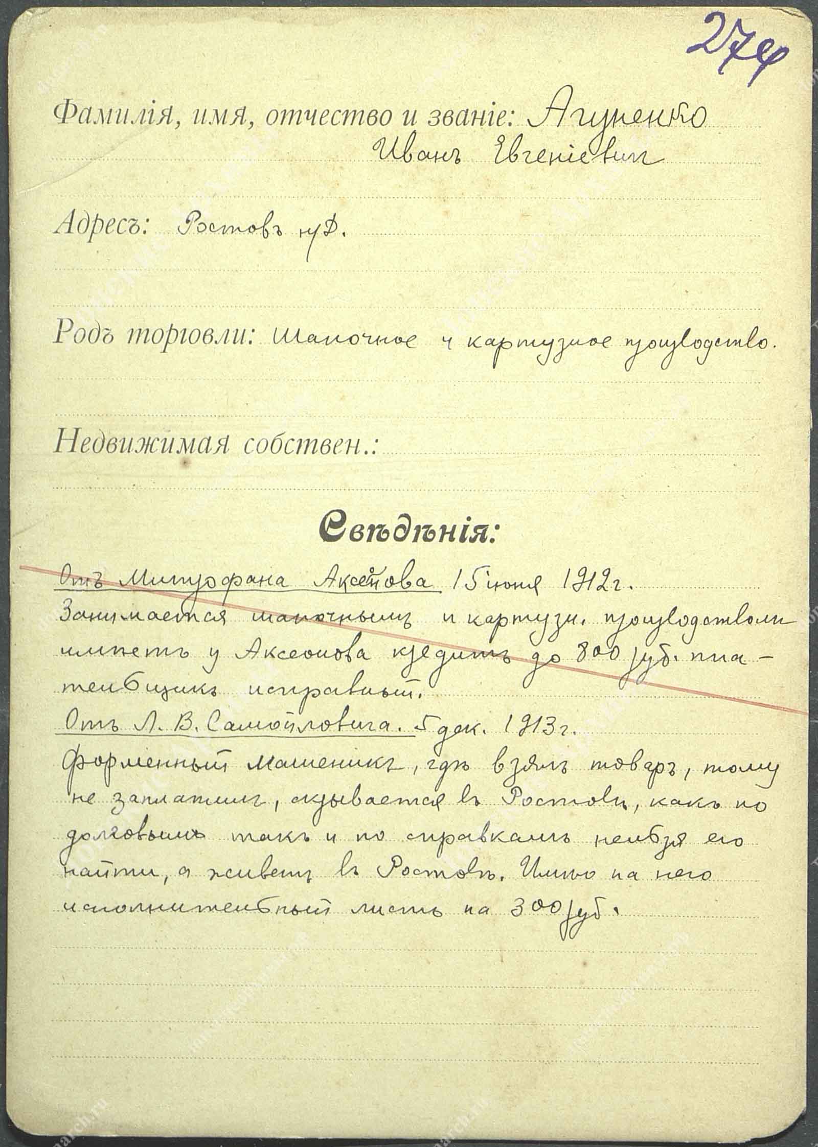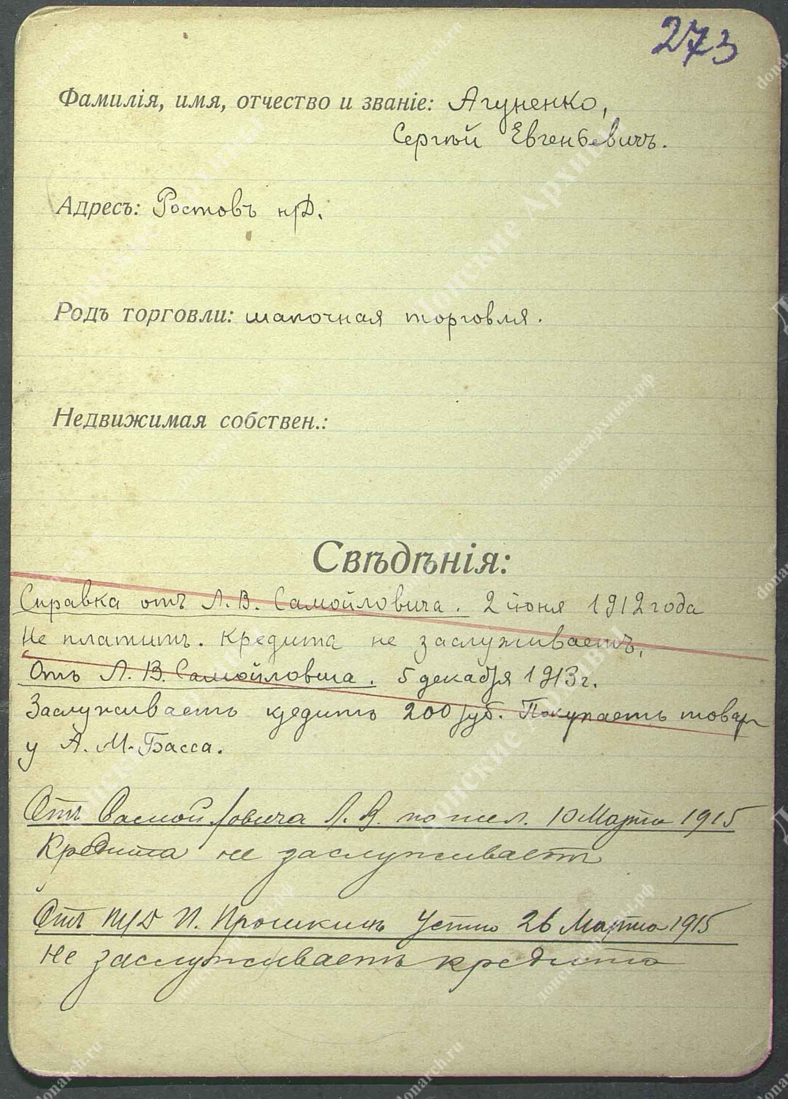 Личная карточка Агуненко Сергея Евгениевича, торговца шапочными товарами в г. Ростове-на-Дону |