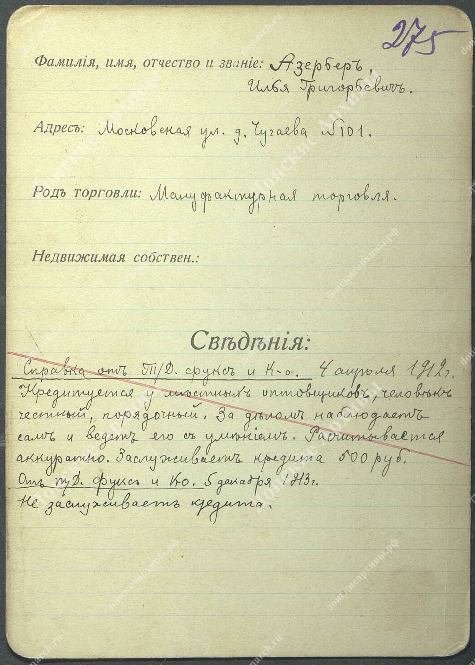 Личная карточка Азербер Ильи Григорьевича, торговца мануфактурными товарами в г. [Ростове-на-Дону], Московская улица, д. Чугаева, 101 |