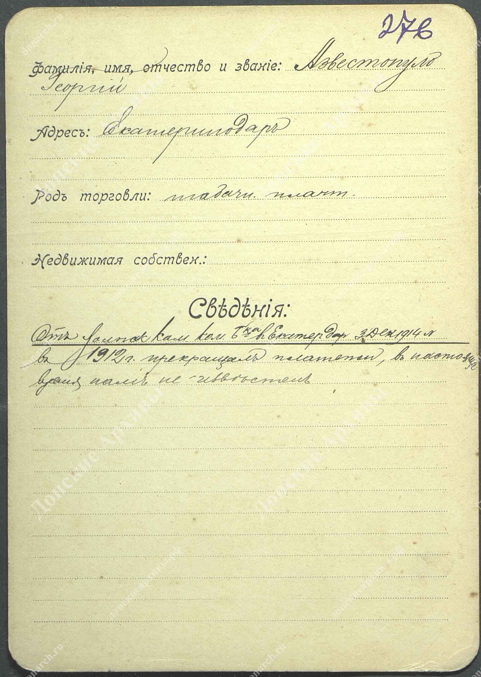 Личная карточка Азвестопуло Георгия, владельца табачными плантациями в г. Екатеринодаре |