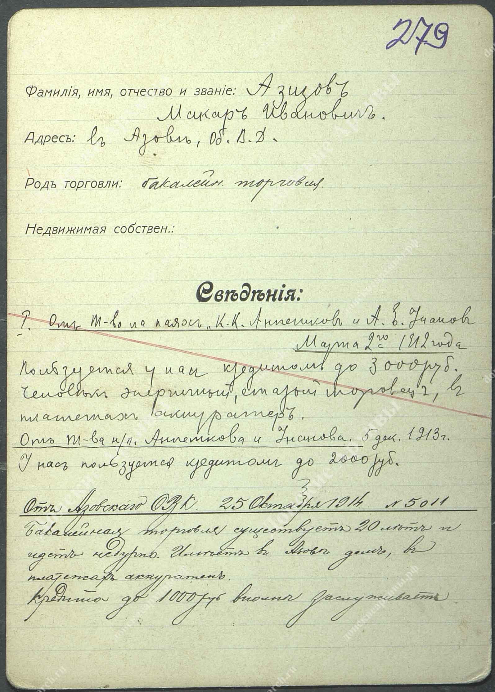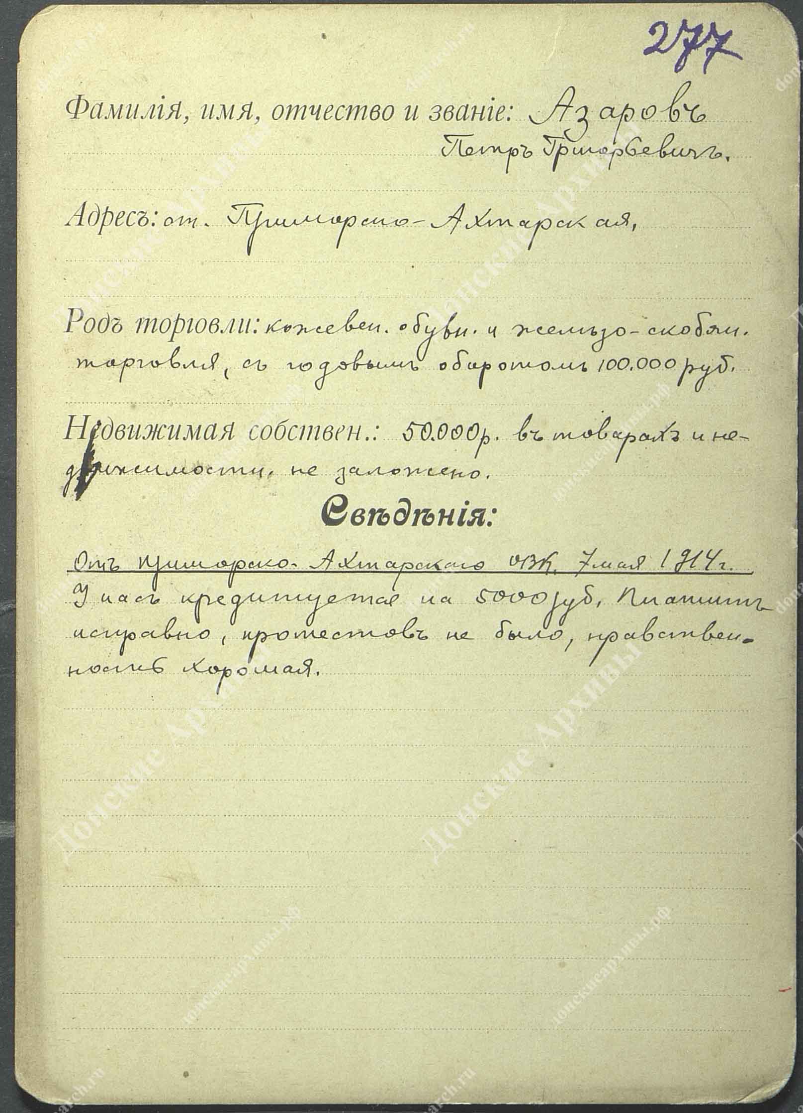 Личная карточка Азарова Петра Григорьевича, торговца кожевенной обувью и железо-скобяными товарами в ст. Приморско-Ахтарской |