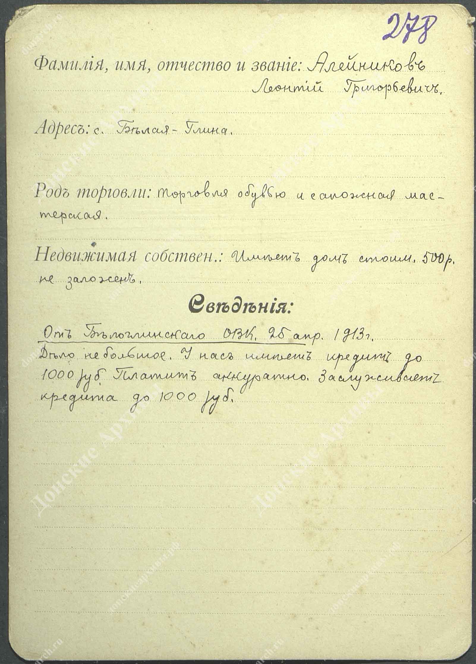 Личная карточка Алейникова Леонтия Григорьевича, торговца обувью в с. Белая Глина |
