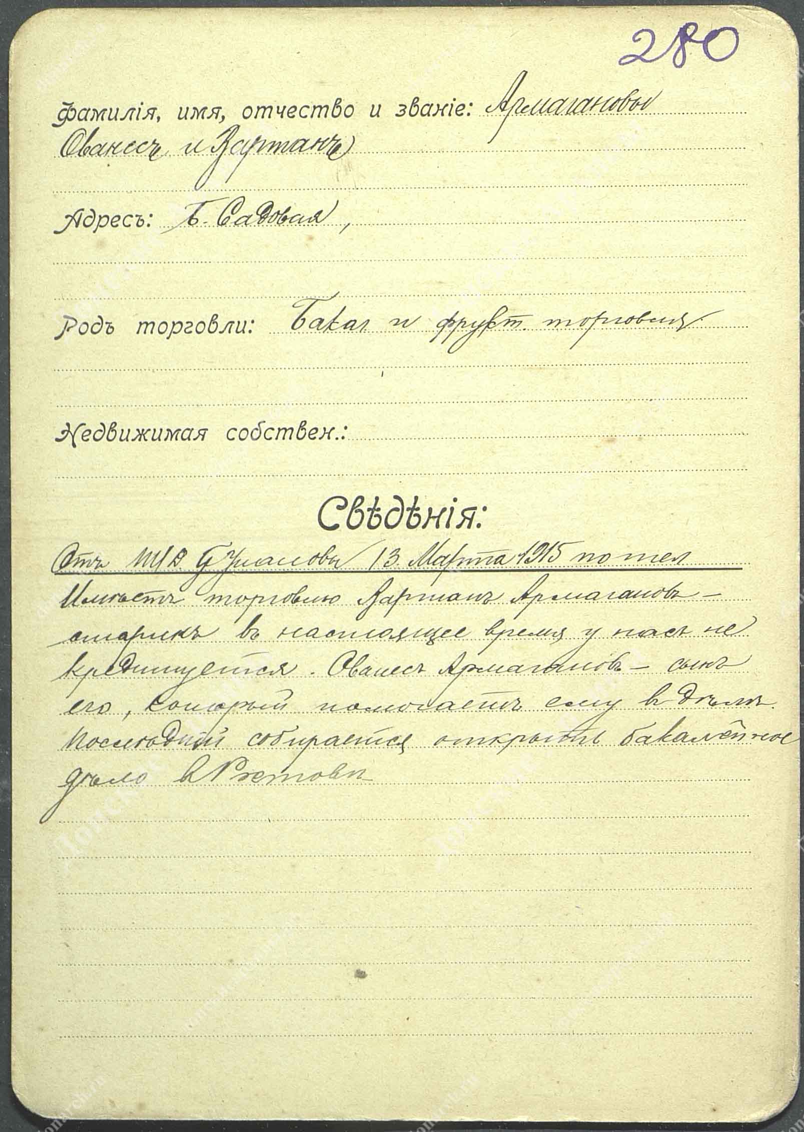 Личная карточка Армагановых Ованеса и Вартана - бакалейная торговля в г.Ростове-на-Дону (Б.Садовая) |