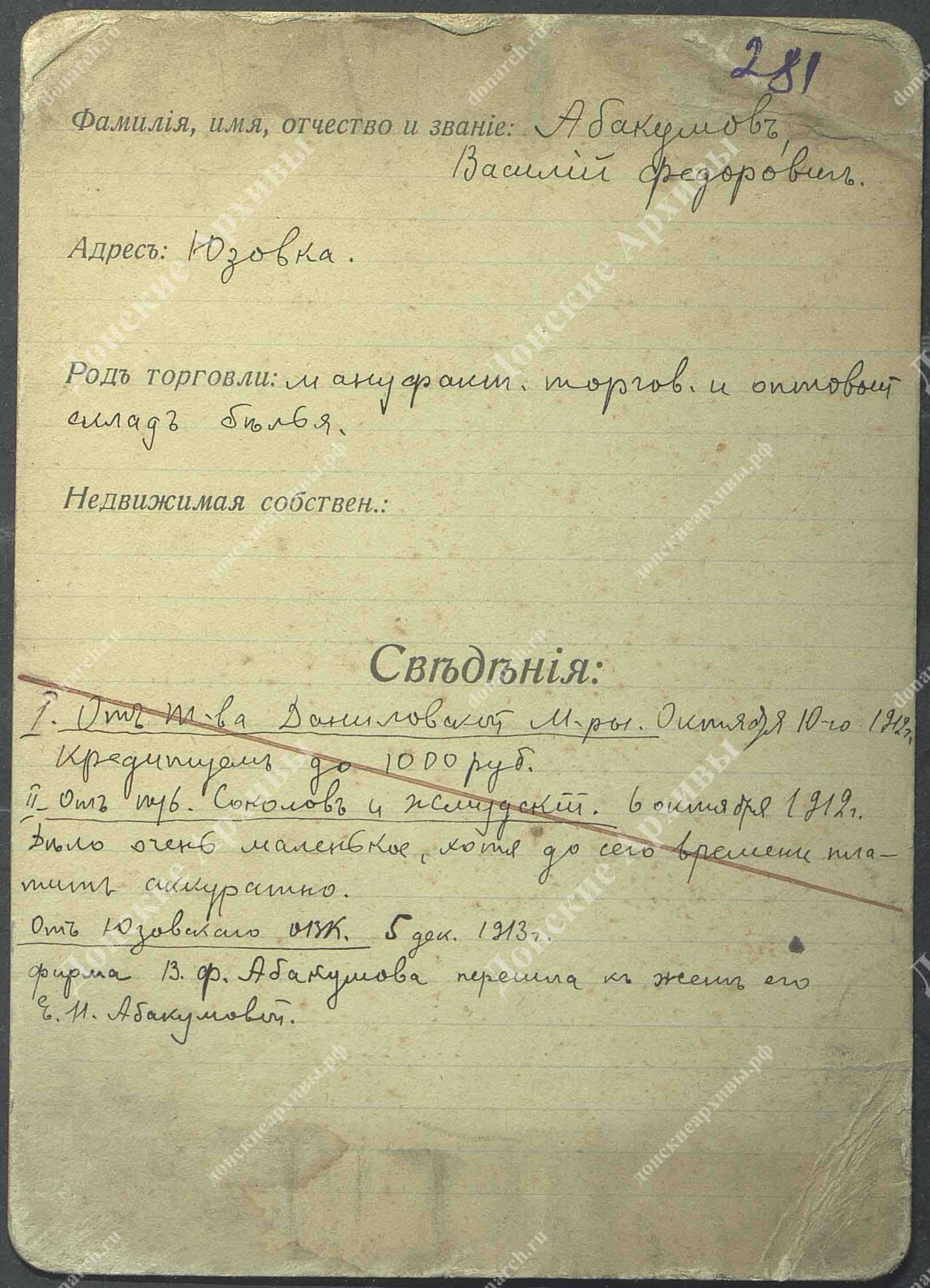 Личная карточка Абакумова Василия Федоровича - мануфактурная торговля и оптовый склад белья в Юзовке |