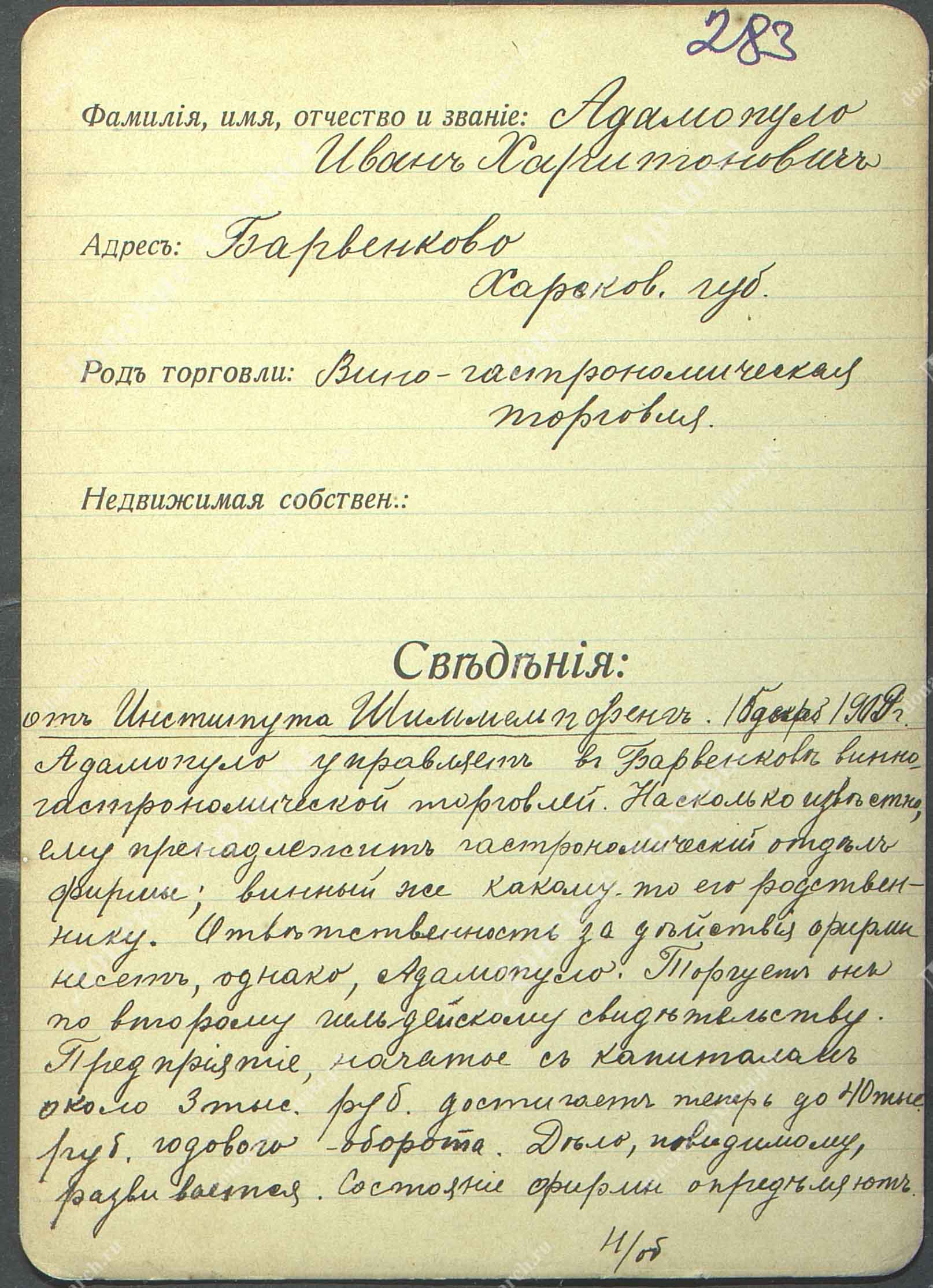 Личная карточка Адамопуло Ивана Харитоновича - вино-гастрономическая торговля в Барвенкове Харьковской губернии |