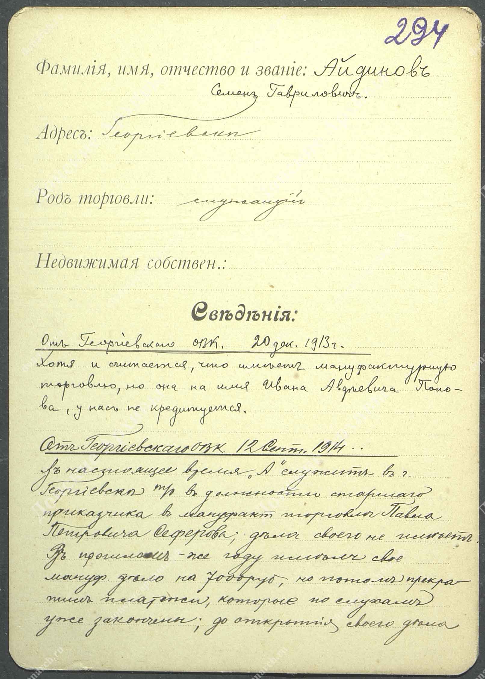 Личная карточка Айдинова Семена Гавриловича - мануфактурная торговля, Георгиевск |