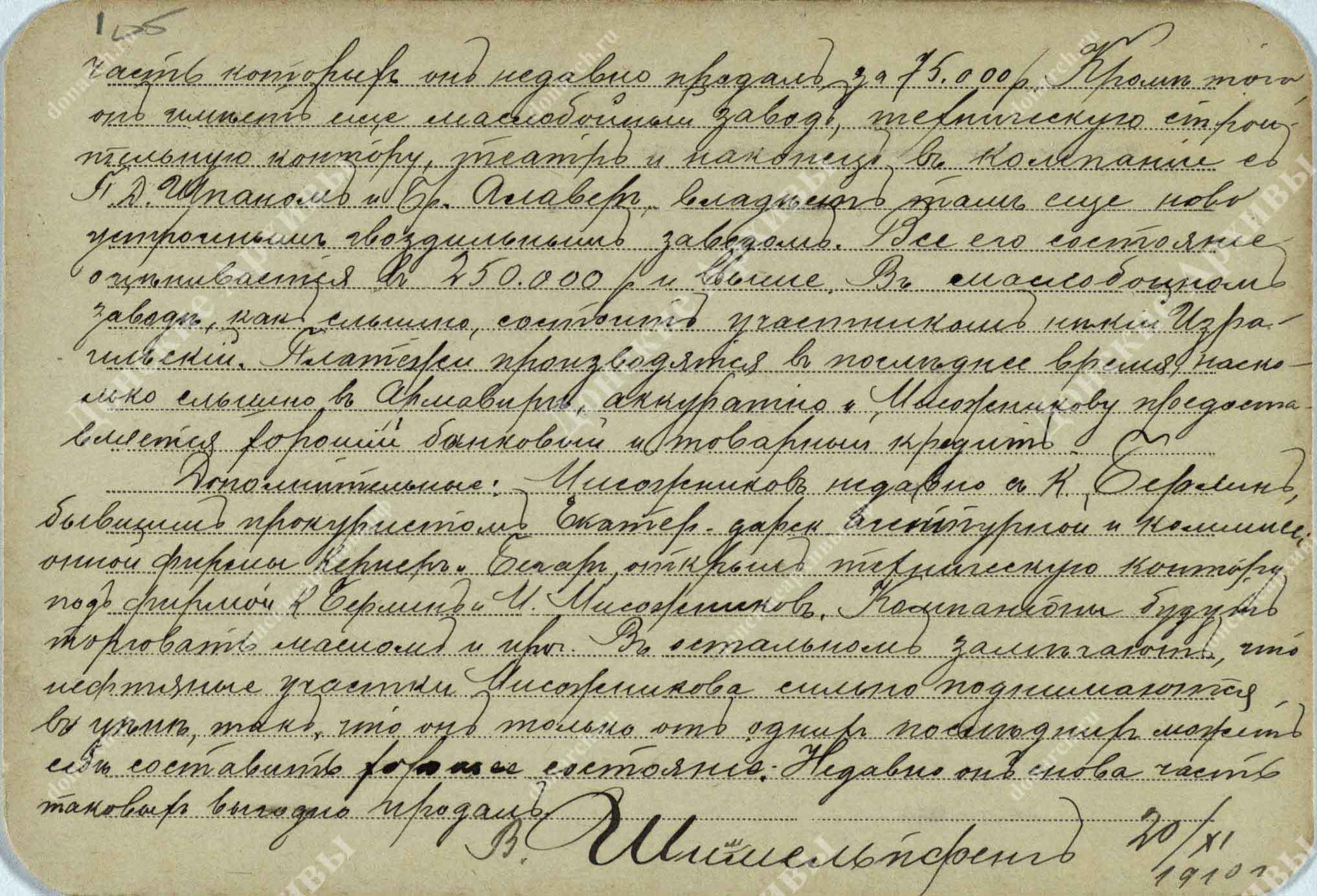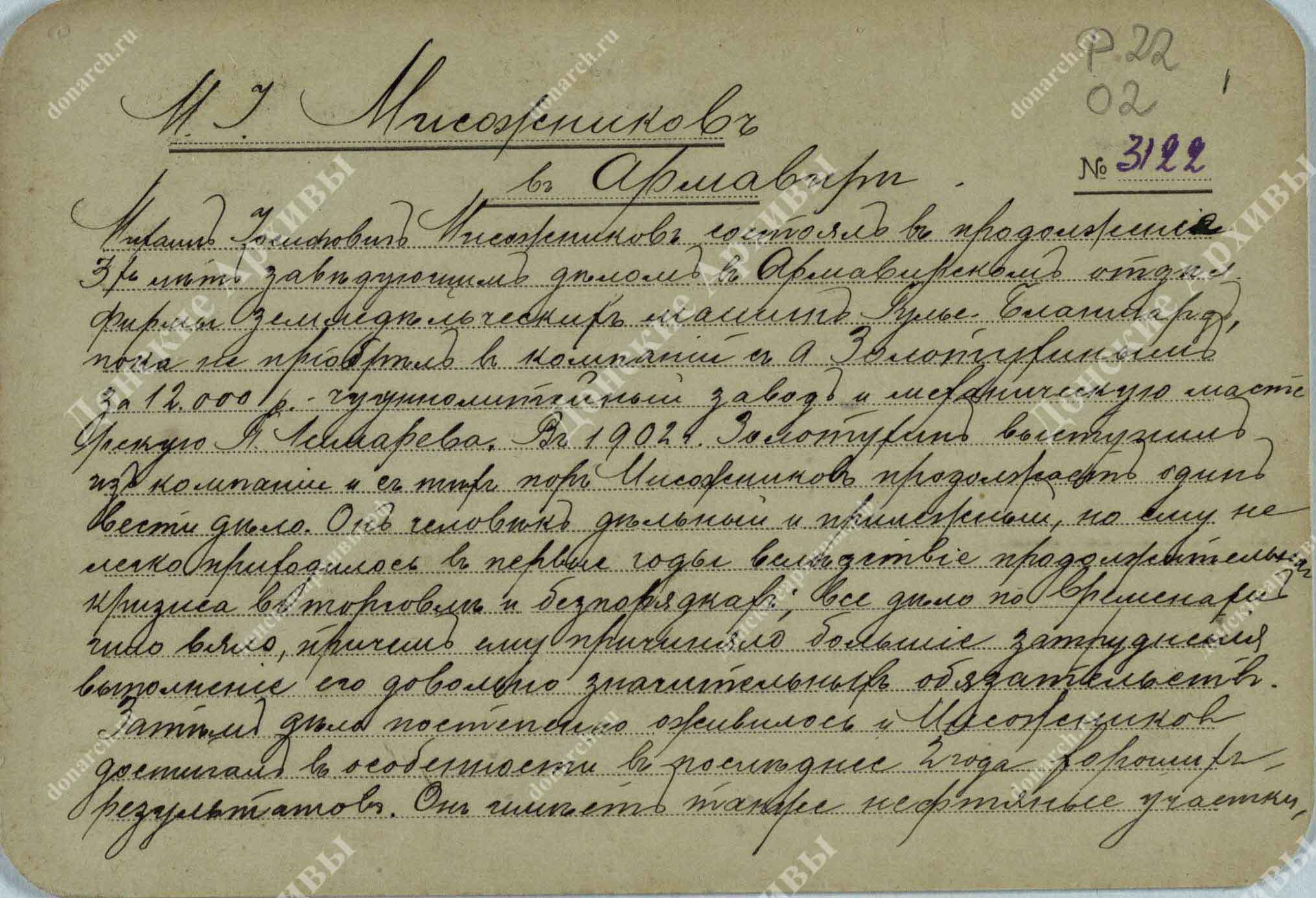 Личная карточка Мисожников Михаил Иосифович - владелец чугунно-литейного завода и механической мастерской, маслобойного завода и технической строительной конторы, театра и гвоздильного завода в Армавире. |