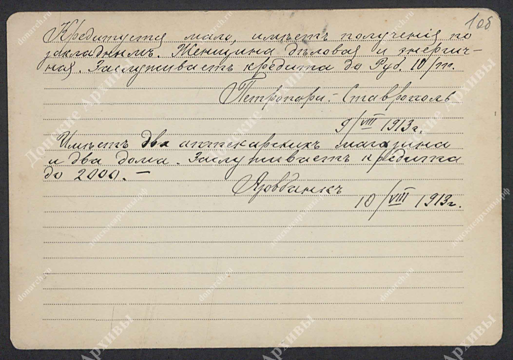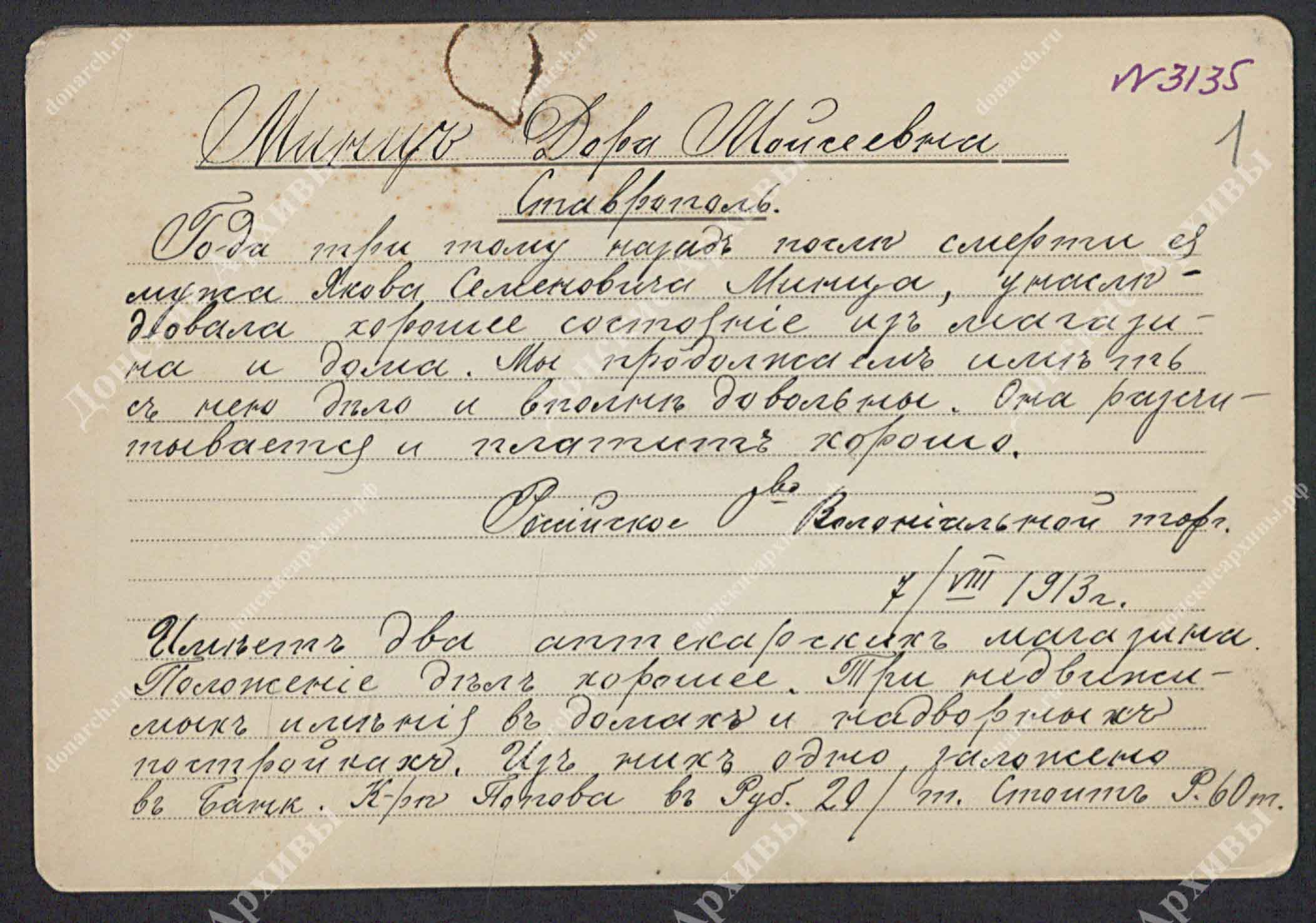 Личная карточка Минц Дора Моисеевна - владелица двух аптекарских магазинов и двух домов в Ставрополе. |