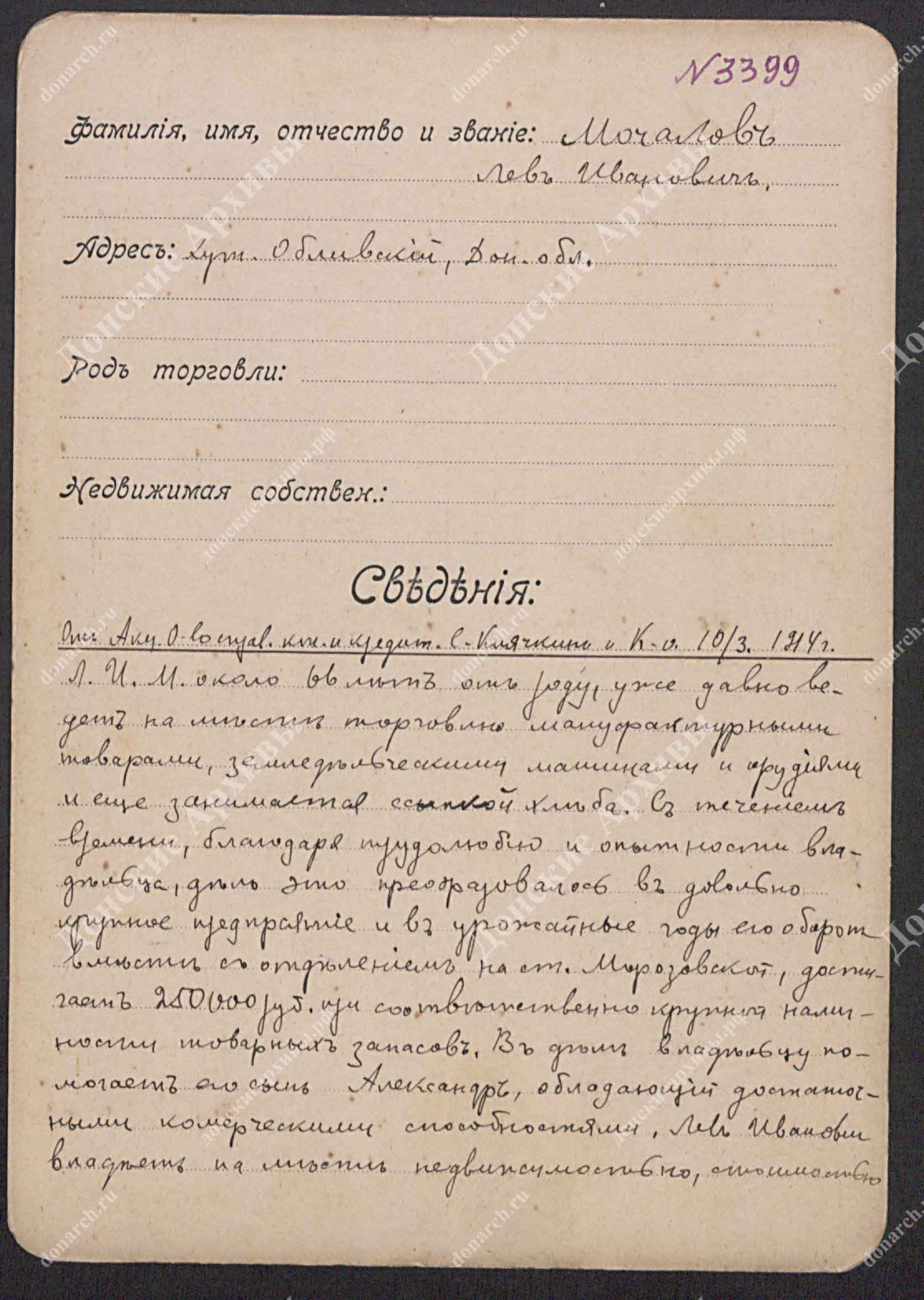 Личная карточка Мочалов Лев Иванович - торговец мануфактурными товарами, земледельческими машинами и орудиями, занимается ссыпкой хлеба в хут. Обливском Донской Области. |