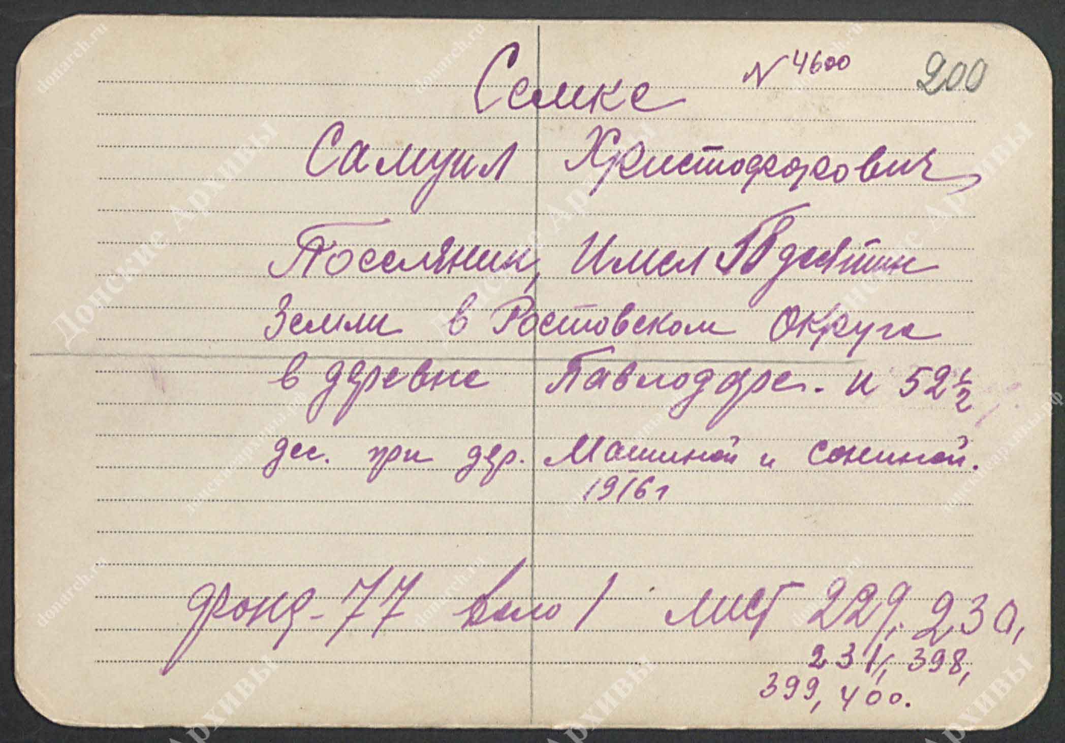 Личная карточка Семке Самуил Христофорович - поселянин, владелец земли в Ростовском Округе при деревне Павлодаре и при деревнях Машиной и Сониной. |