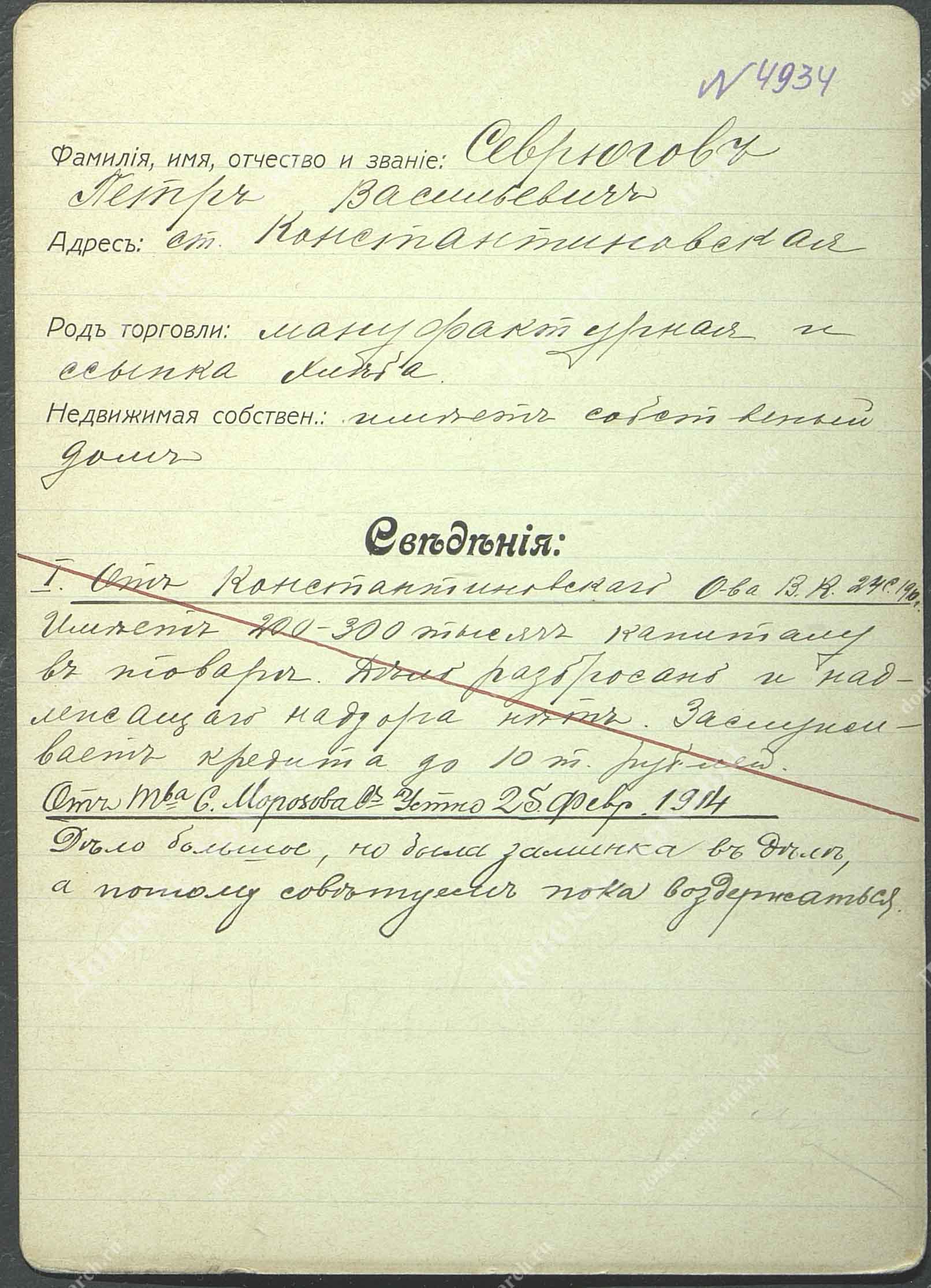 Личная карточка Севрюгов Петр Васильевич - владелец дома, ссыпки хлеба, торговец мануфактурными товарами в ст. Константиновской. |