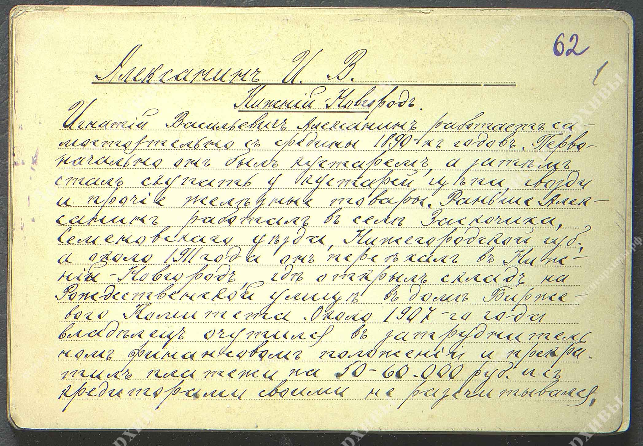 Личная карточка Алексанина Игнатия Васильевича, владельцца склада в Нижнем Новгороде |