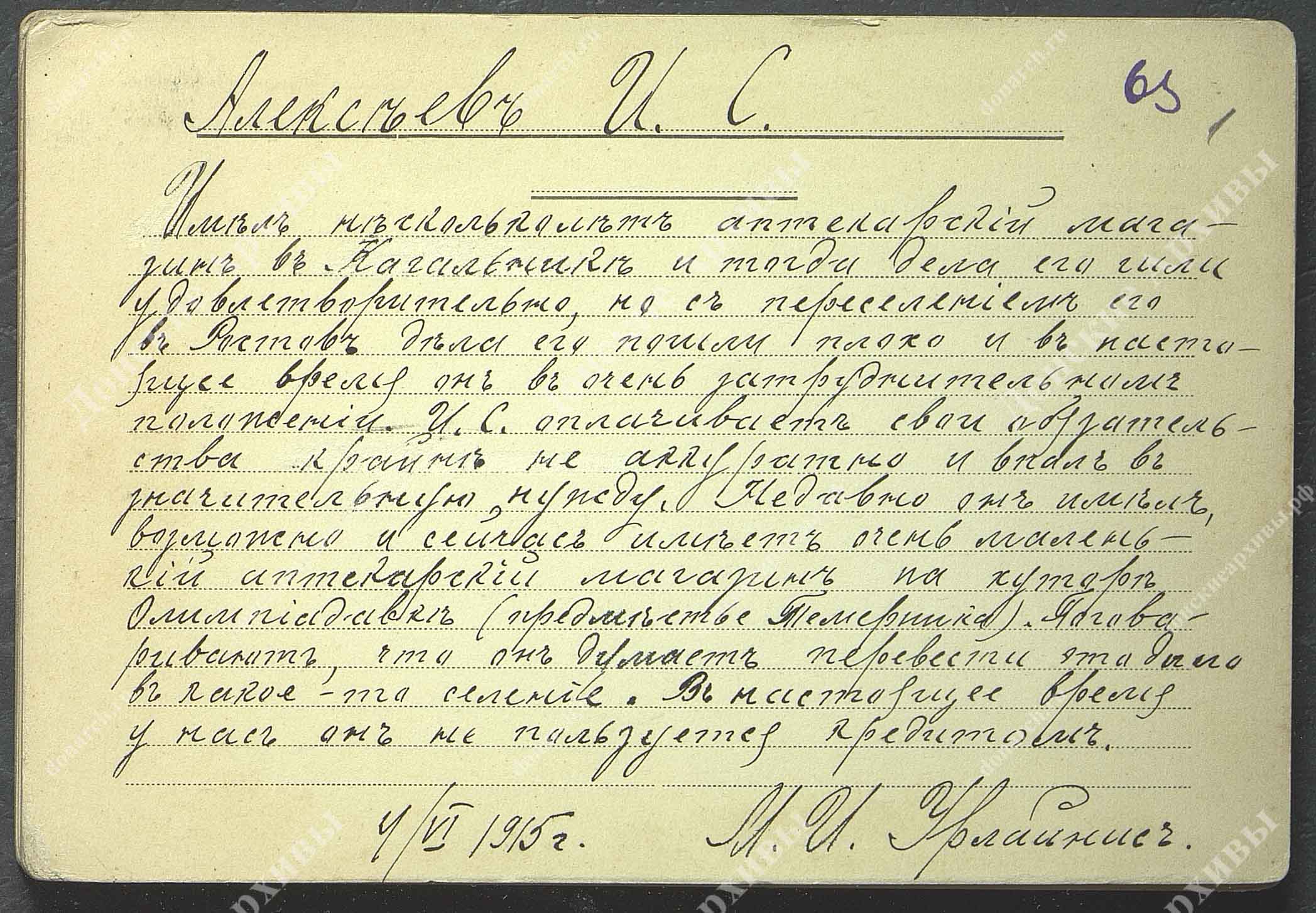 Личная карточка Алексеева И.С., владельца аптекарского магазина в Кагальнике, Олимпиадовке |