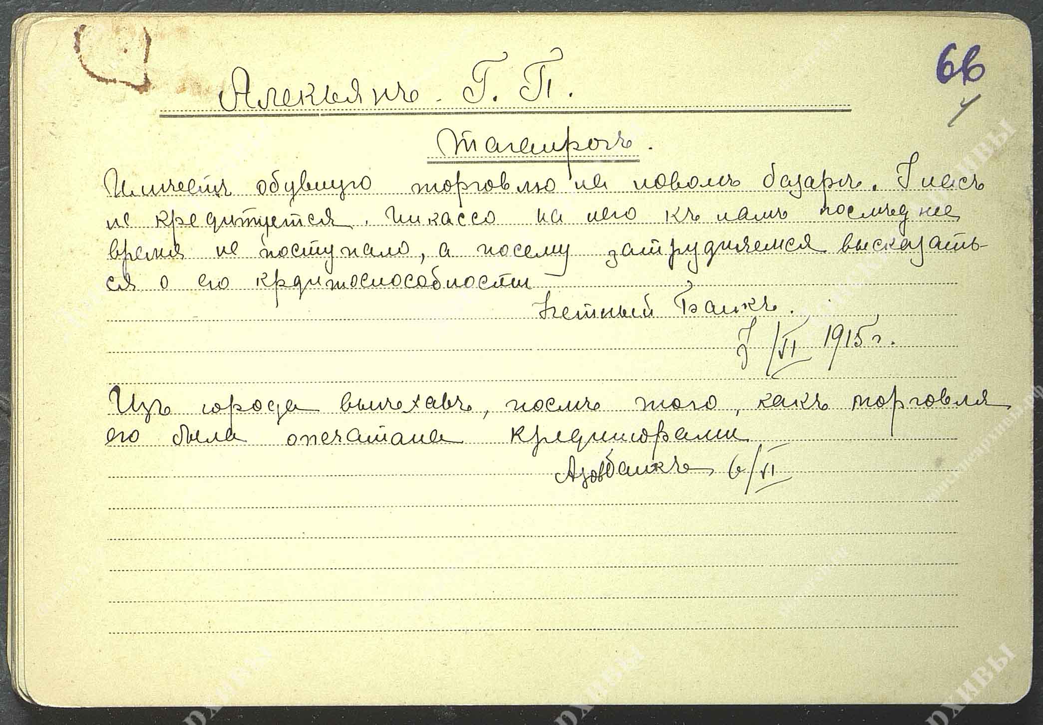 Личная карточка Алекьян Г. П., владельца обувной торговли в г.Таганроге |