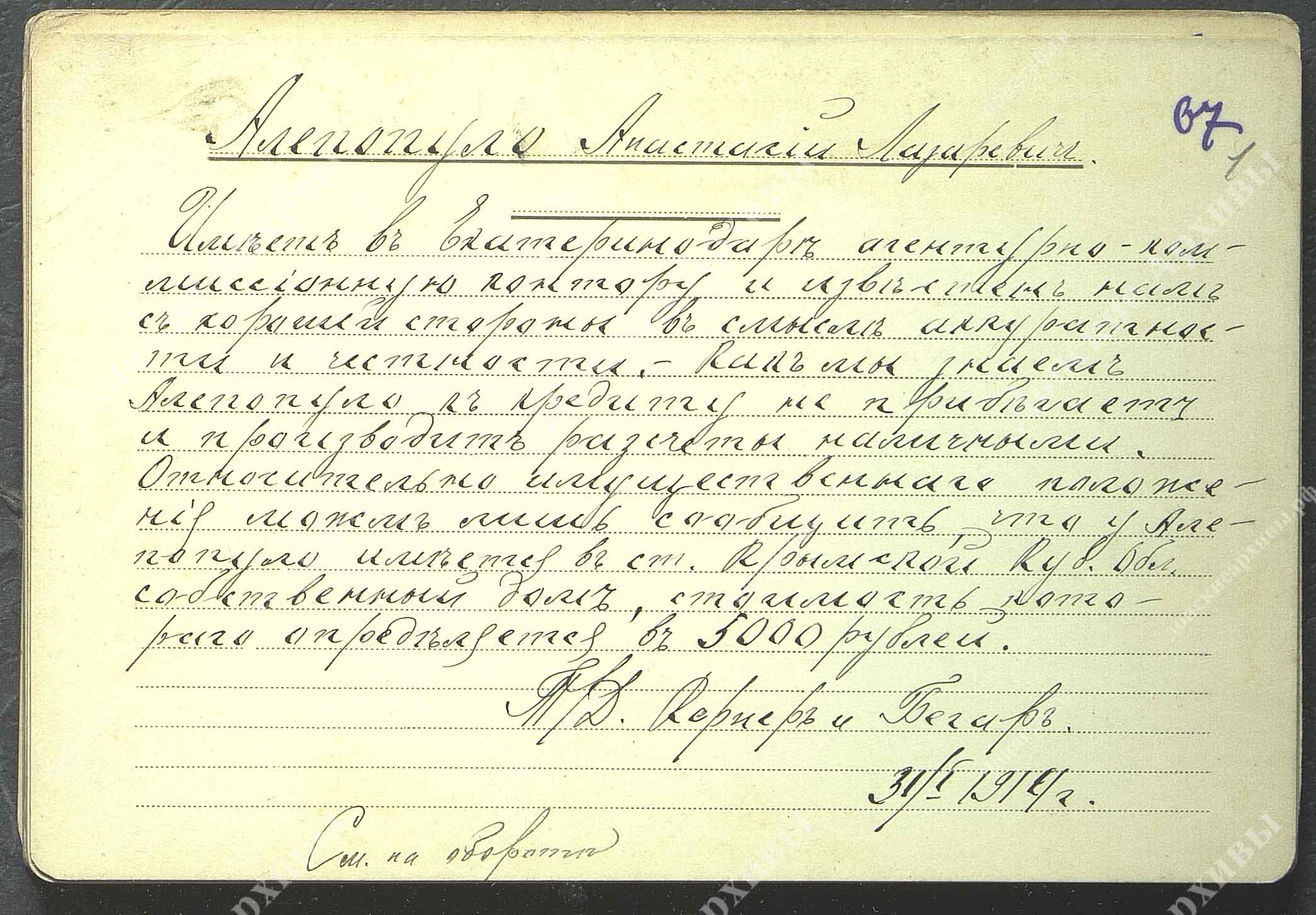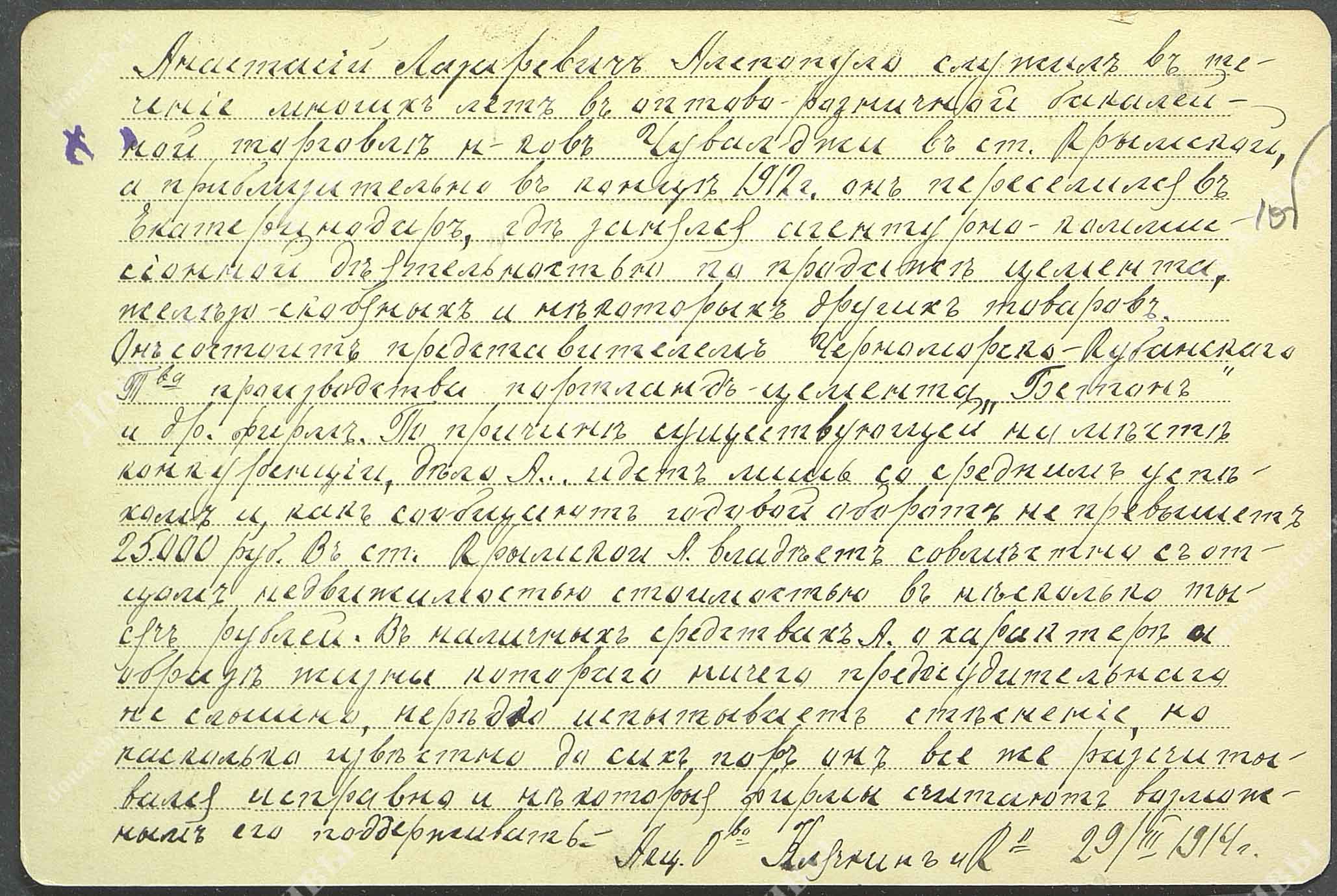 Личная карточка Алепопуло Анастасия Лазаревича, владельца агентурно-комиссионной торговли в Екатеринодаре, собственника дома в ст.Крымской Кубанской области |
