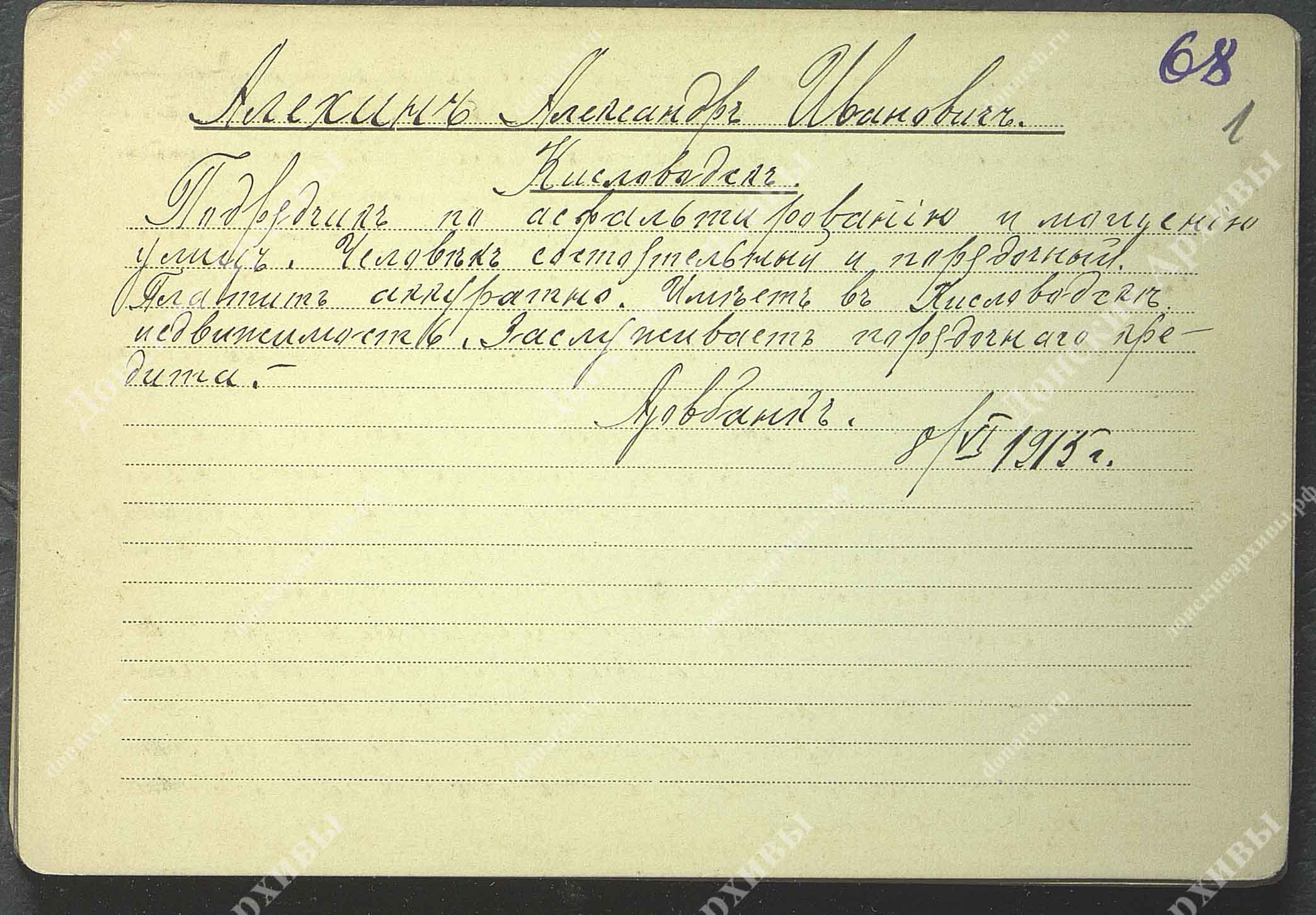 Личная карточка Алехина Александра Ивановича, подрядчика по асфальтированию и мощению улиц, владельца недвижимости в Кисловодске |