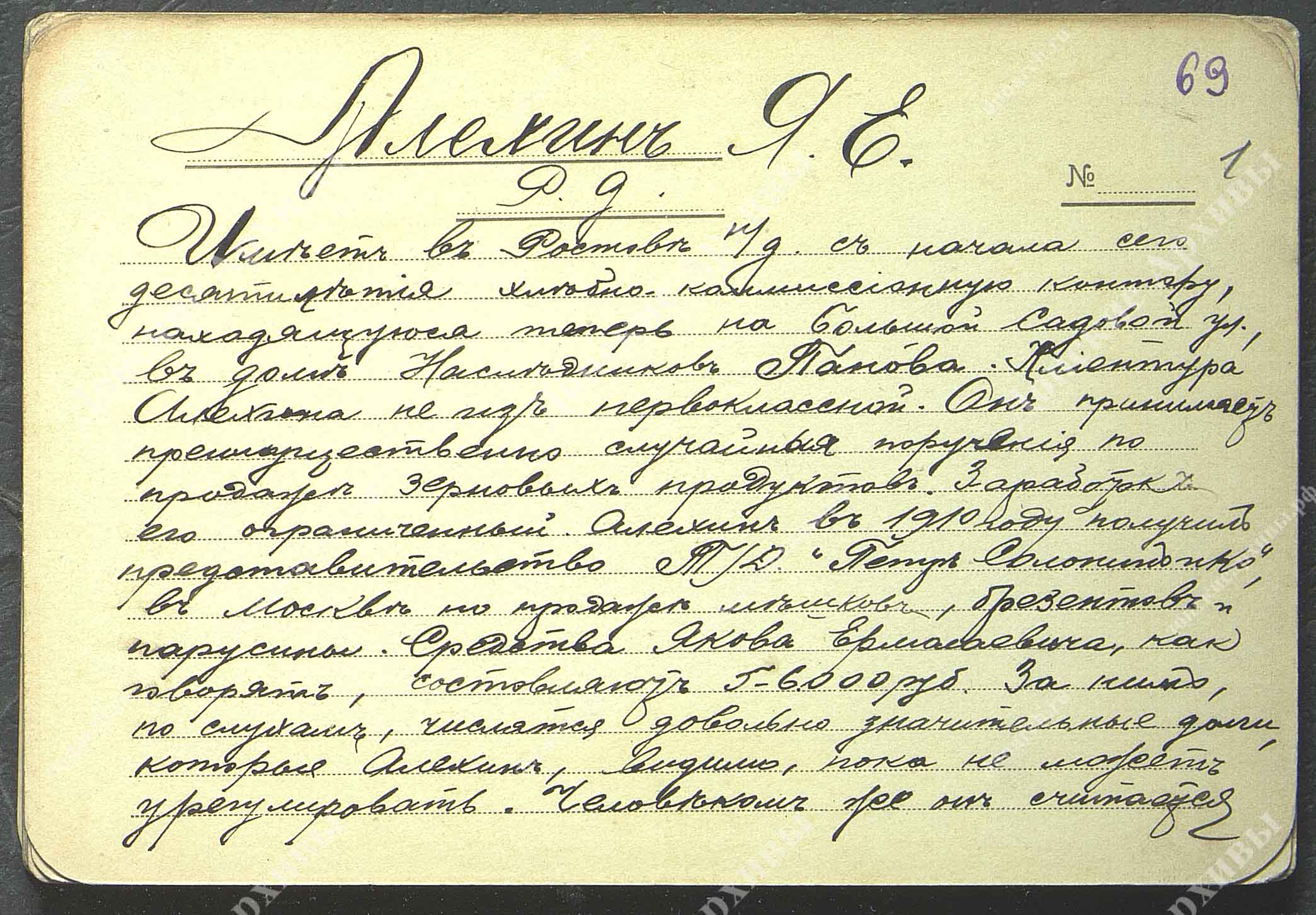 Личная карточка Алехина Я. Е., владельца хлебно-комиссионной торговли в Ростове-на-Дону |