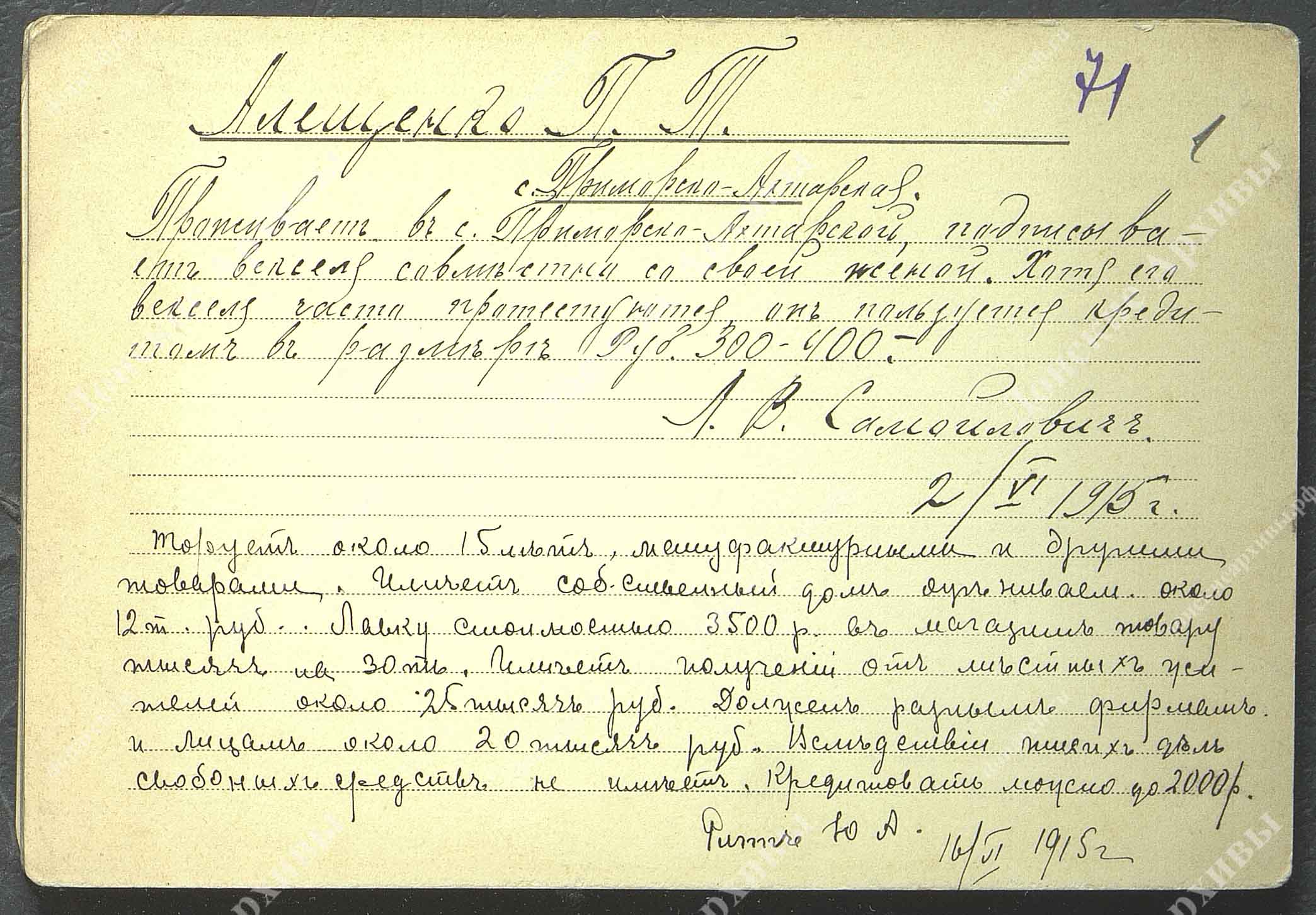 Личная карточка Алещенко П.Т., торговца мануфактурными товарами в с.Приморско-Ахтарском |