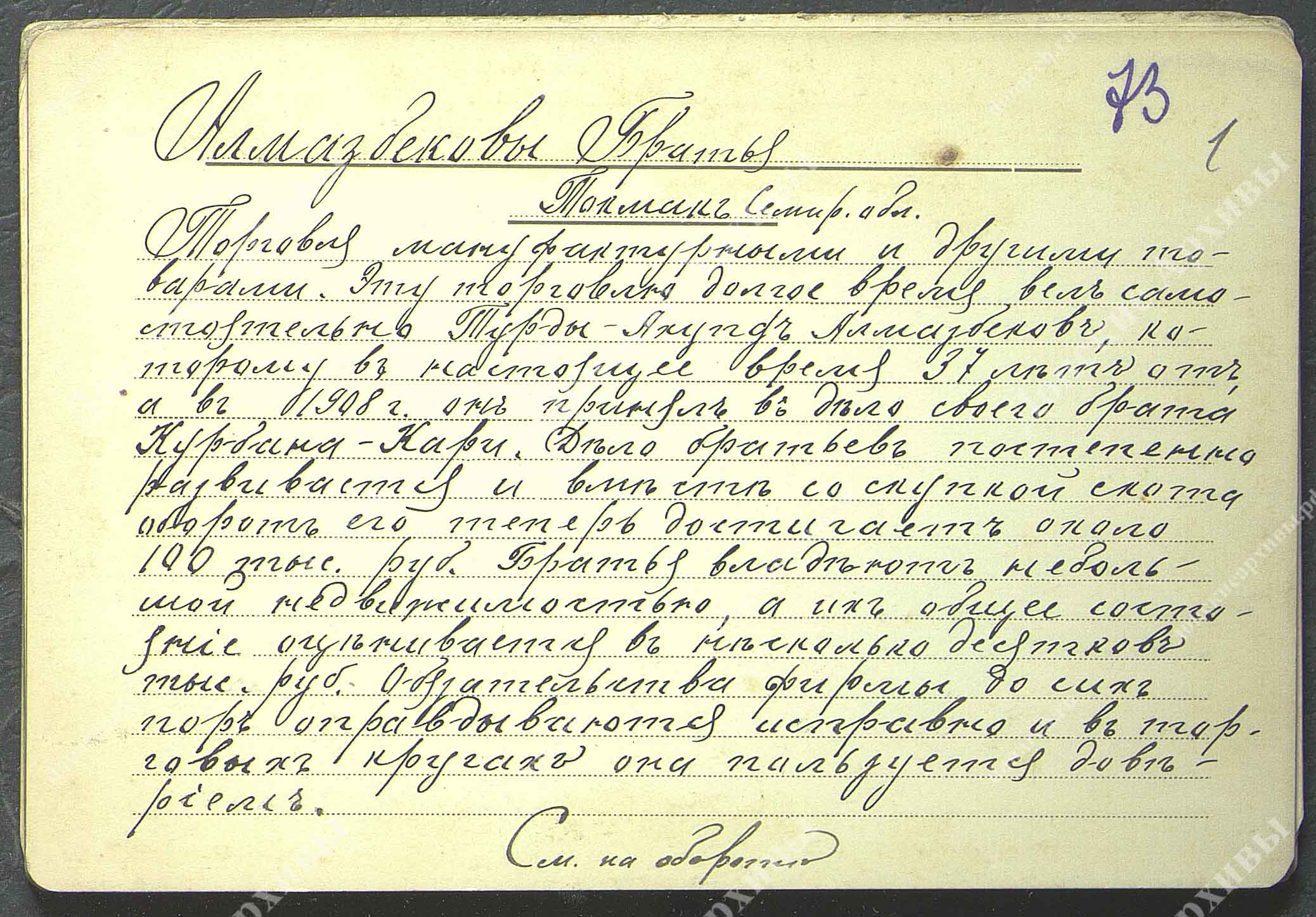 Личная карточка Аптекманов А. и Михаила, владельцев иллюзиона в Самарканде |