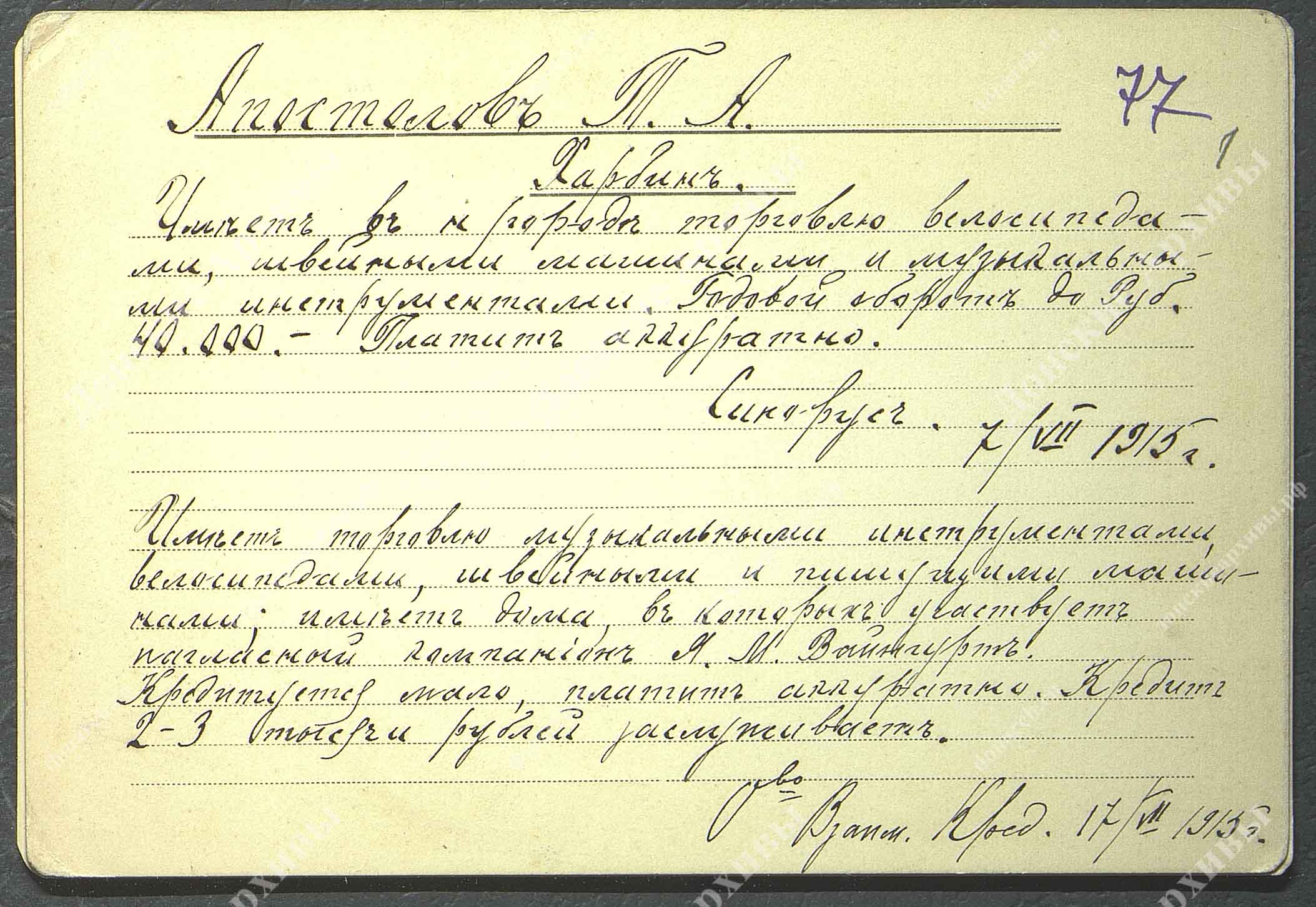 Личная карточка Апостолова Т.А., торговца велосипедами, швейными машинами и музыкальными инструментами в Харбине |