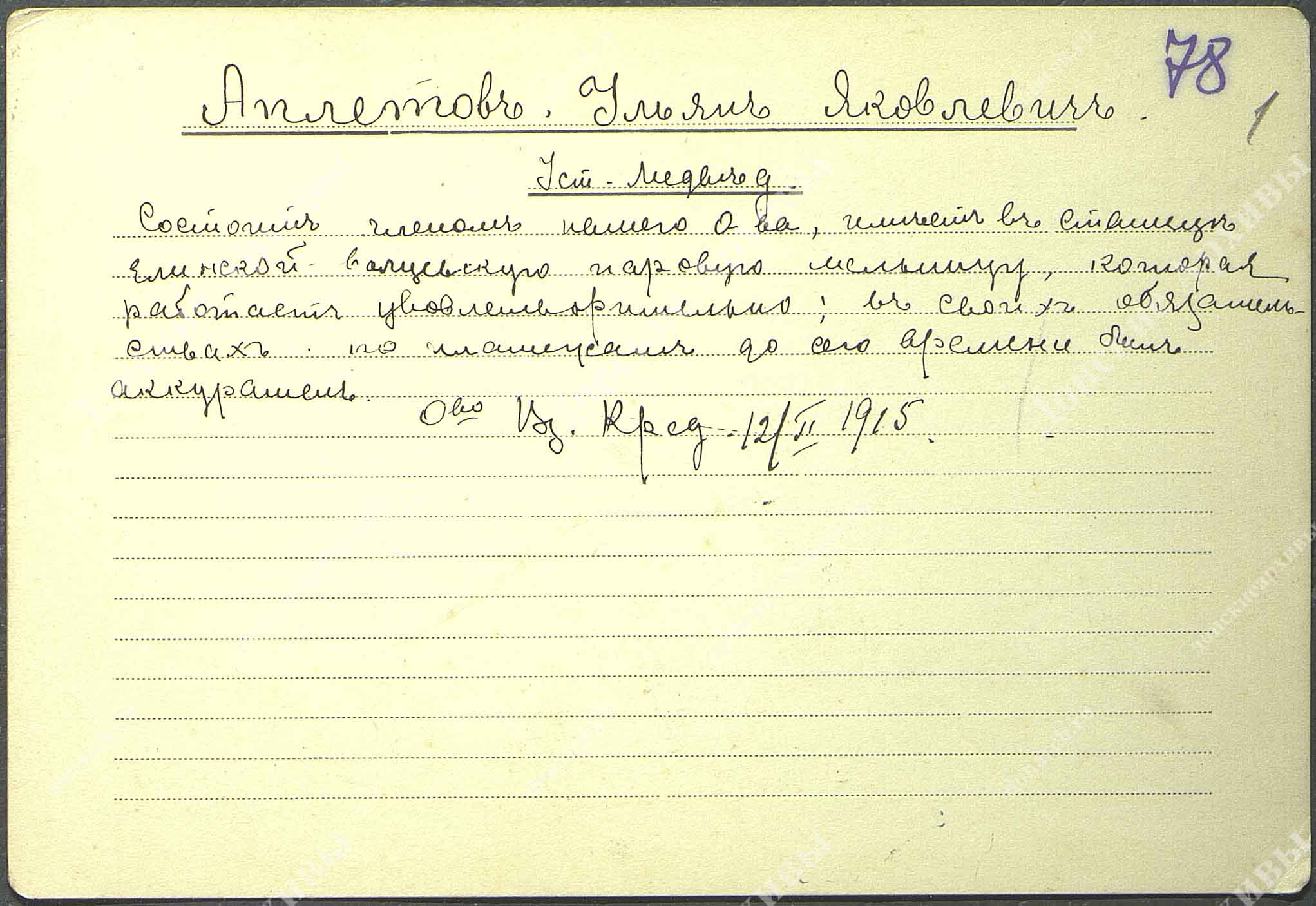 Личная карточка Аплетова Ульяна Яковлевича, владельца мельницы в ст.Еланской |